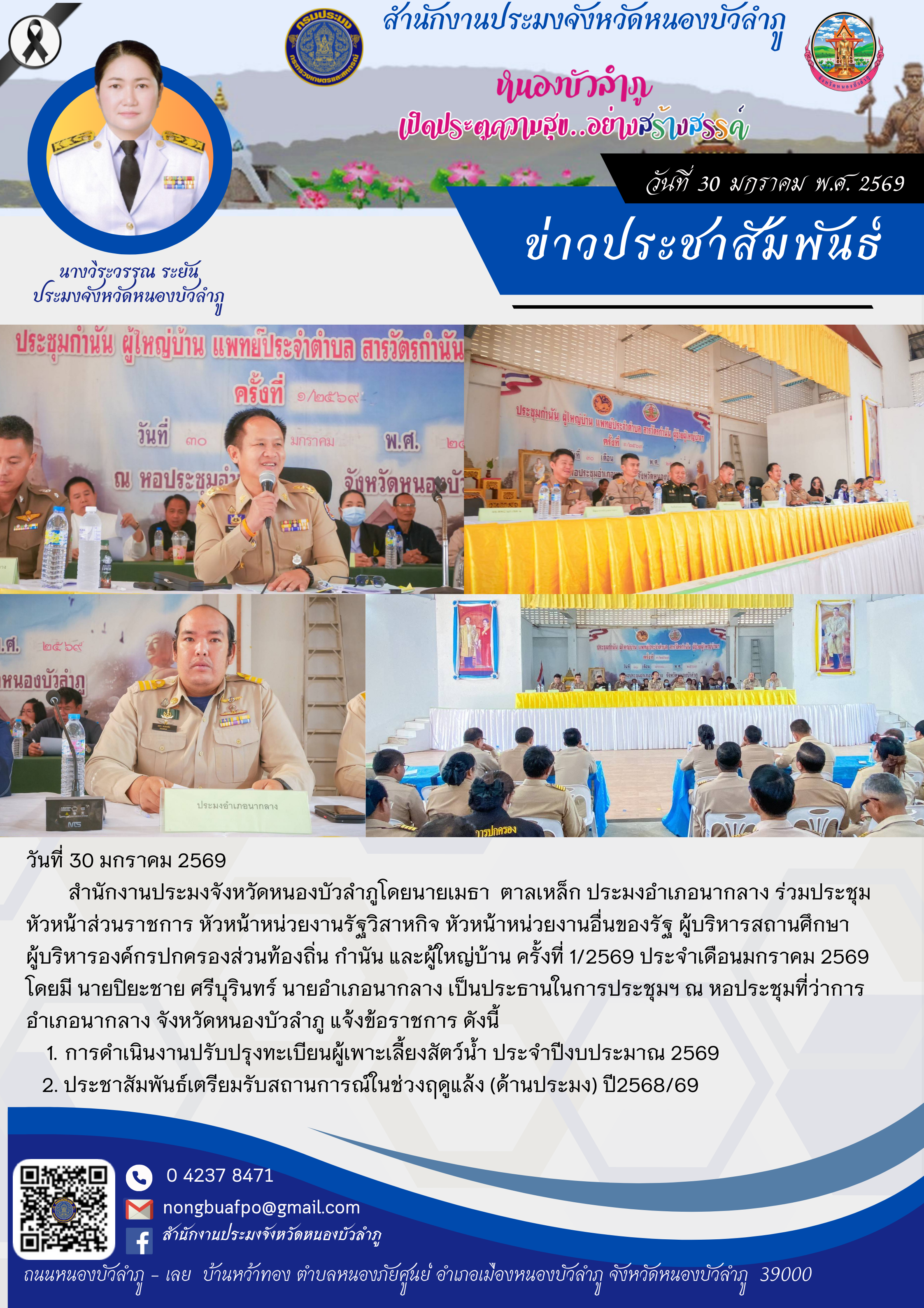 สำนักงานประมงจังหวัดหนองบัวลำภูโดยนายเมธา ตาลเหล็ก ประมงอำเภอนากลาง ร่วมประชุมหัวหน้าส่วนราชการ หัวหน้าหน่วยงานรัฐวิสาหกิจ หัวหน้าหน่วยงานอื่นของรัฐ ผู้บริหารสถานศึกษาผู้บริหารองค์กรปกครองส่วนท้องถิ่น กำนัน และผู้ใหญ่บ้าน ครั้งที่ 1/2569 ประจำเดือนมกราคม 2569 โดยมี นายปิยะชาย ศรีบุรินทร์ นายอำเภอนากลาง เป็นประธานในการประชุมฯ ณ หอประชุมที่ว่าการอำเภอนากลาง จังหวัดหนองบัวลำภู แจ้งข้อราชการ ดังนี้