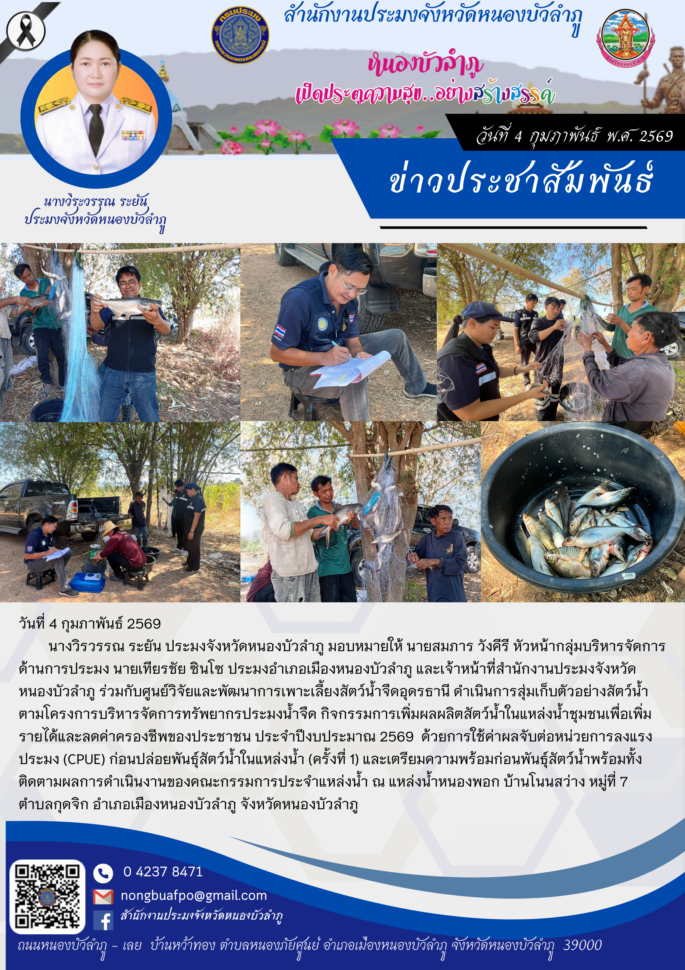 นางวิรวรรณ ระยัน ประมงจังหวัดหนองบัวลำภู มอบหมายให้ นายสมภาร วังคีรี หัวหน้ากลุ่มบริหารจัดการด้านการประมง นายเทียรชัย ซินโซ ประมงอำเภอเมืองหนองบัวลำภู และเจ้าหน้าที่สำนักงานประมงจังหวัดหนองบัวลำภู ร่วมกับศูนย์วิจัยและพัฒนาการเพาะเลี้ยงสัตว์น้ำจืดอุดรธานี ดำเนินการสุ่มเก็บตัวอย่างสัตว์น้ำ ตามโครงการบริหารจัดการทรัพยากรประมงน้ำจืด กิจกรรมการเพิ่มผลผลิตสัตว์น้ำในแหล่งน้ำชุมชนเพื่อเพิ่มรายได้และลดค่าครองชีพของประชาชน ประจำปีงบประมาณ 2569 ด้วยการใช้ค่าผลจับต่อหน่วยการลงแรงประมง (CPUE) ก่อนปล่อยพันธุ์สัตว์น้ำในแหล่งน้ำ (ครั้งที่ 1) และเตรียมความพร้อมก่อนพันธุ์สัตว์น้ำพร้อมทั้งติดตามผลการดำเนินงานของคณะกรรมการประจำแหล่งน้ำ ณ แหล่งน้ำหนองพอก บ้านโนนสว่าง หมู่ที่ 7 ตำบลกุดจิก อำเภอเมืองหนองบัวลำภู จังหวัดหนองบัวลำภู