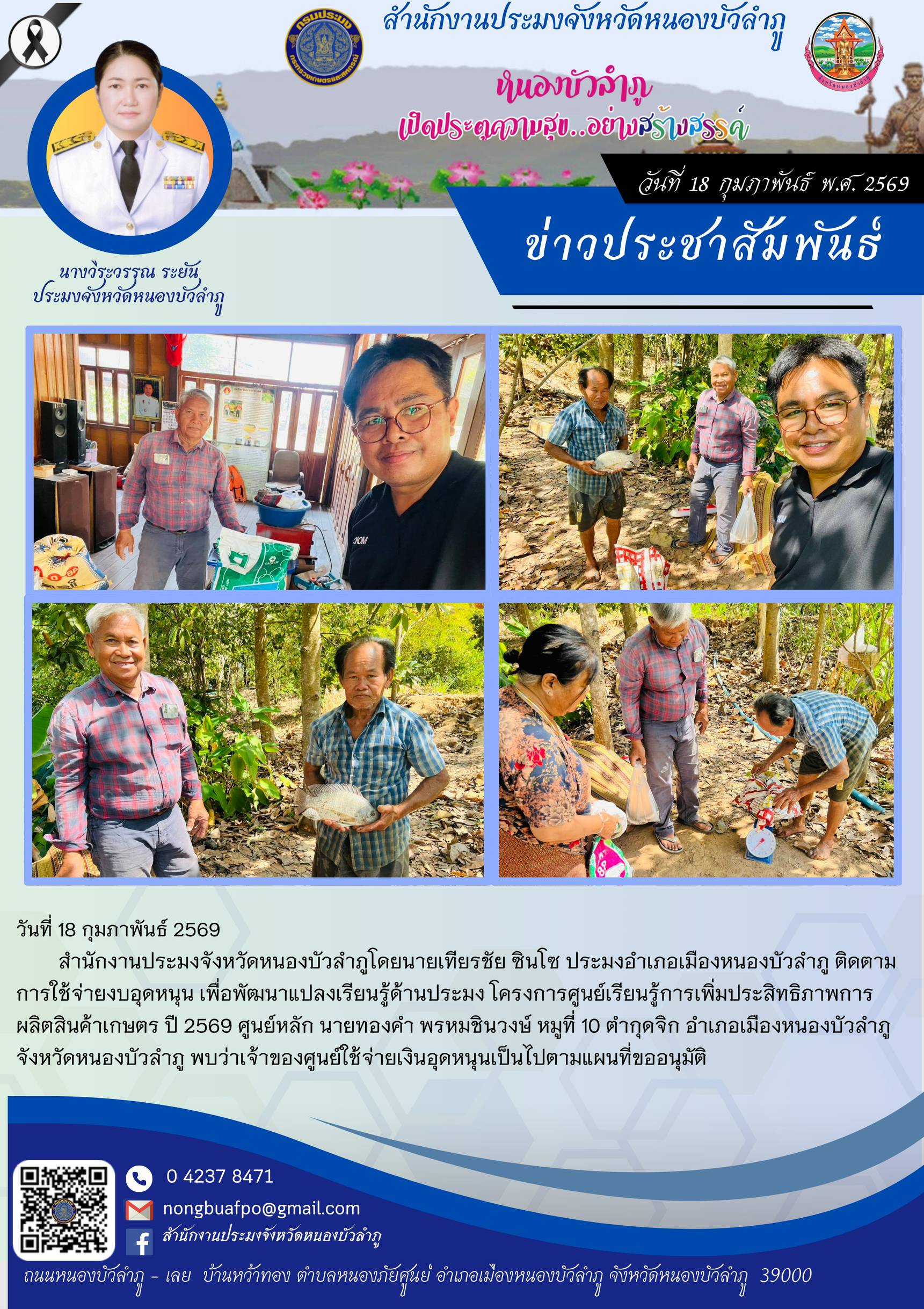 สำนักงานประมงจังหวัดหนองบัวลำภูโดยนายเทียรชัย ซินโซ ประมงอำเภอเมืองหนองบัวลำภู ติดตามการใช้จ่ายงบอุดหนุน เพื่อพัฒนาแปลงเรียนรู้ด้านประมง โครงการศูนย์เรียนรู้การเพิ่มประสิทธิภาพการผลิตสินค้าเกษตร ปี 2569 ศูนย์หลัก นายทองคำ พรหมชินวงษ์ หมูที่ 10 ตำกุดจิก อำเภอเมืองหนองบัวลำภู จังหวัดหนองบัวลำภู พบว่าเจ้าของศูนย์ใช้จ่ายเงินอุดหนุนเป็นไปตามแผนที่ขออนุมัติ