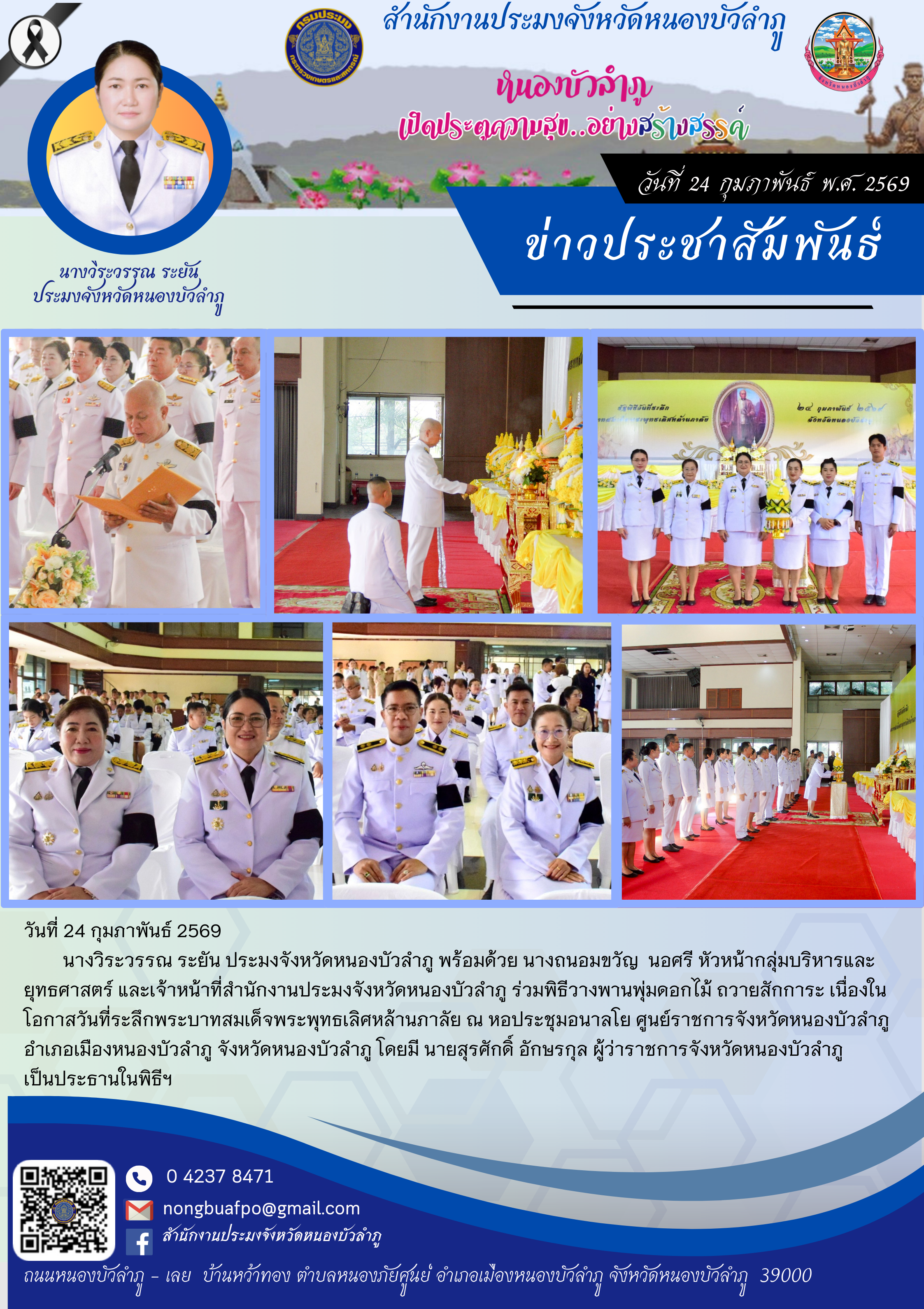 นางวิระวรรณ ระยัน ประมงจังหวัดหนองบัวลำภู พร้อมด้วย นางถนอมขวัญ นอศรี หัวหน้ากลุ่มบริหารและยุทธศาสตร์ และเจ้าหน้าที่สำนักงานประมงจังหวัดหนองบัวลำภู ร่วมพิธีวางพานพุ่มดอกไม้ ถวายสักการะ เนื่องในโอกาสวันที่ระลึกพระบาทสมเด็จพระพุทธเลิศหล้านภาลัย ณ หอประชุมอนาลโย ศูนย์ราชการจังหวัดหนองบัวลำภู อำเภอเมืองหนองบัวลำภู จังหวัดหนองบัวลำภู โดยมี นายสุรศักดิ์ อักษรกุล ผู้ว่าราชการจังหวัดหนองบัวลำภู เป็นประธานในพิธีฯ