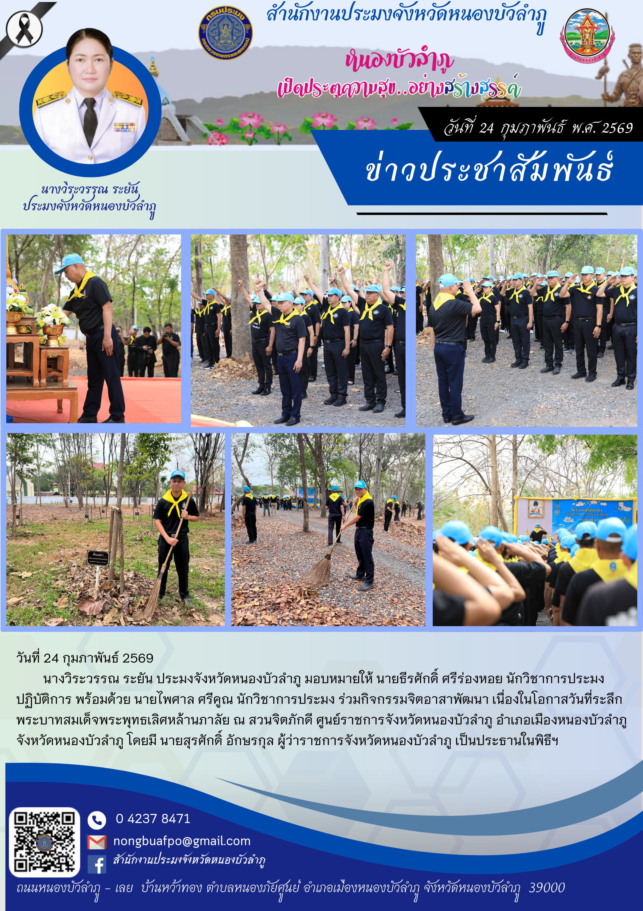 นางวิระวรรณ ระยัน ประมงจังหวัดหนองบัวลำภู มอบหมายให้ นายธีรศักดิ์ ศรีร่องหอย นักวิชาการประมงปฏิบัติการ พร้อมด้วย นายไพศาล ศรีคูณ นักวิชาการประมง ร่วมกิจกรรมจิตอาสาพัฒนา เนื่องในโอกาสวันที่ระลึกพระบาทสมเด็จพระพุทธเลิศหล้านภาลัย ณ สวนจิตภักดี ศูนย์ราชการจังหวัดหนองบัวลำภู อำเภอเมืองหนองบัวลำภู จังหวัดหนองบัวลำภู โดยมี นายสุรศักดิ์ อักษรกุล ผู้ว่าราชการจังหวัดหนองบัวลำภู เป็นประธานในพิธีฯ