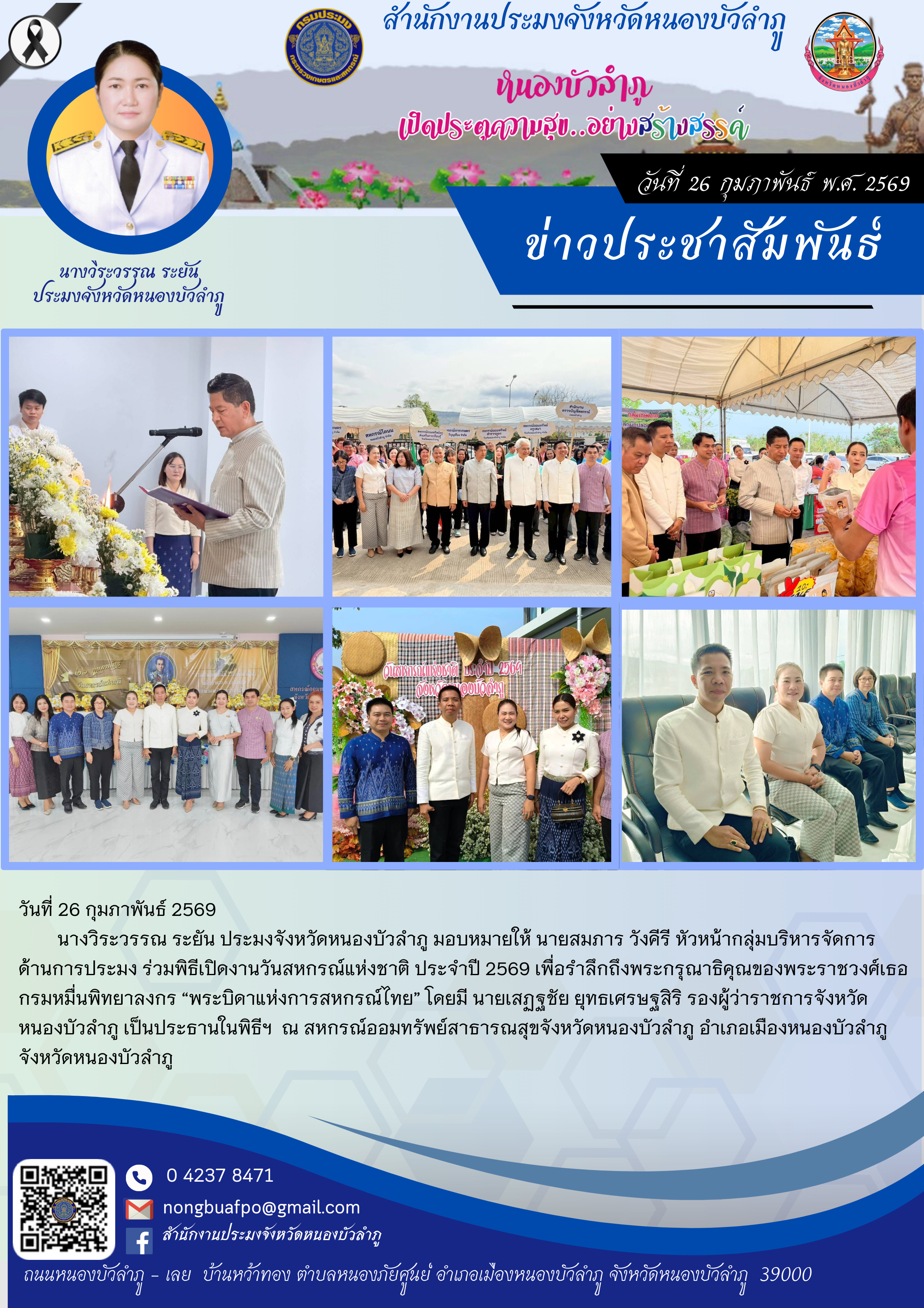 นางวิระวรรณ ระยัน ประมงจังหวัดหนองบัวลำภู มอบหมายให้ นายสมภาร วังคีรี หัวหน้ากลุ่มบริหารจัดการด้านการประมง ร่วมพิธีเปิดงานวันสหกรณ์แห่งชาติ ประจำปี 2569 เพื่อรำลึกถึงพระกรุณาธิคุณของพระราชวงศ์เธอกรมหมื่นพิทยาลงกร “พระบิดาแห่งการสหกรณ์ไทย” โดยมี นายเสฏฐชัย ยุทธเศรษฐสิริ รองผู้ว่าราชการจังหวัดหนองบัวลำภู เป็นประธานในพิธีฯ ณ สหกรณ์ออมทรัพย์สาธารณสุขจังหวัดหนองบัวลำภู อำเภอเมืองหนองบัวลำภู จังหวัดหนองบัวลำภู