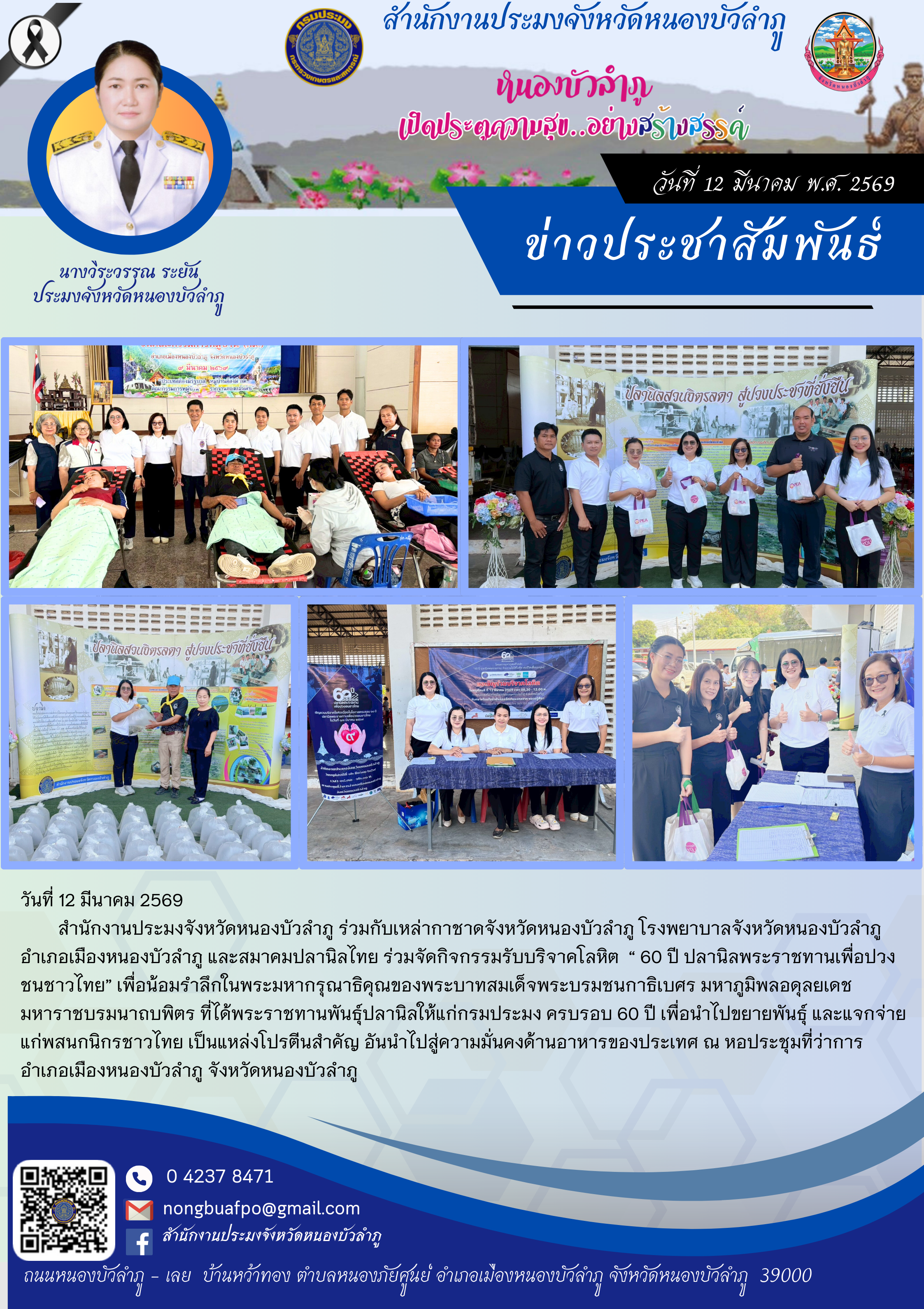 สำนักงานประมงจังหวัดหนองบัวลำภู ร่วมกับเหล่ากาชาดจังหวัดหนองบัวลำภู โรงพยาบาลจังหวัดหนองบัวลำภู อำเภอเมืองหนองบัวลำภู และสมาคมปลานิลไทย ร่วมจัดกิจกรรมรับบริจาคโลหิต “ 60 ปี ปลานิลพระราชทานเพื่อปวงชนชาวไทย” เพื่อน้อมรำลึกในพระมหากรุณาธิคุณของพระบาทสมเด็จพระบรมชนกาธิเบศร มหาภูมิพลอดุลยเดชมหาราชบรมนาถบพิตร ที่ได้พระราชทานพันธุ์ปลานิลให้แก่กรมประมง ครบรอบ 60 ปี เพื่อนำไปขยายพันธุ์ และแจกจ่ายแก่พสนกนิกรชาวไทย เป็นแหล่งโปรตีนสำคัญ อันนำไปสู่ความมั่นคงด้านอาหารของประเทศ ณ หอประชุมที่ว่าการอำเภอเมืองหนองบัวลำภู จังหวัดหนองบัวลำภู
