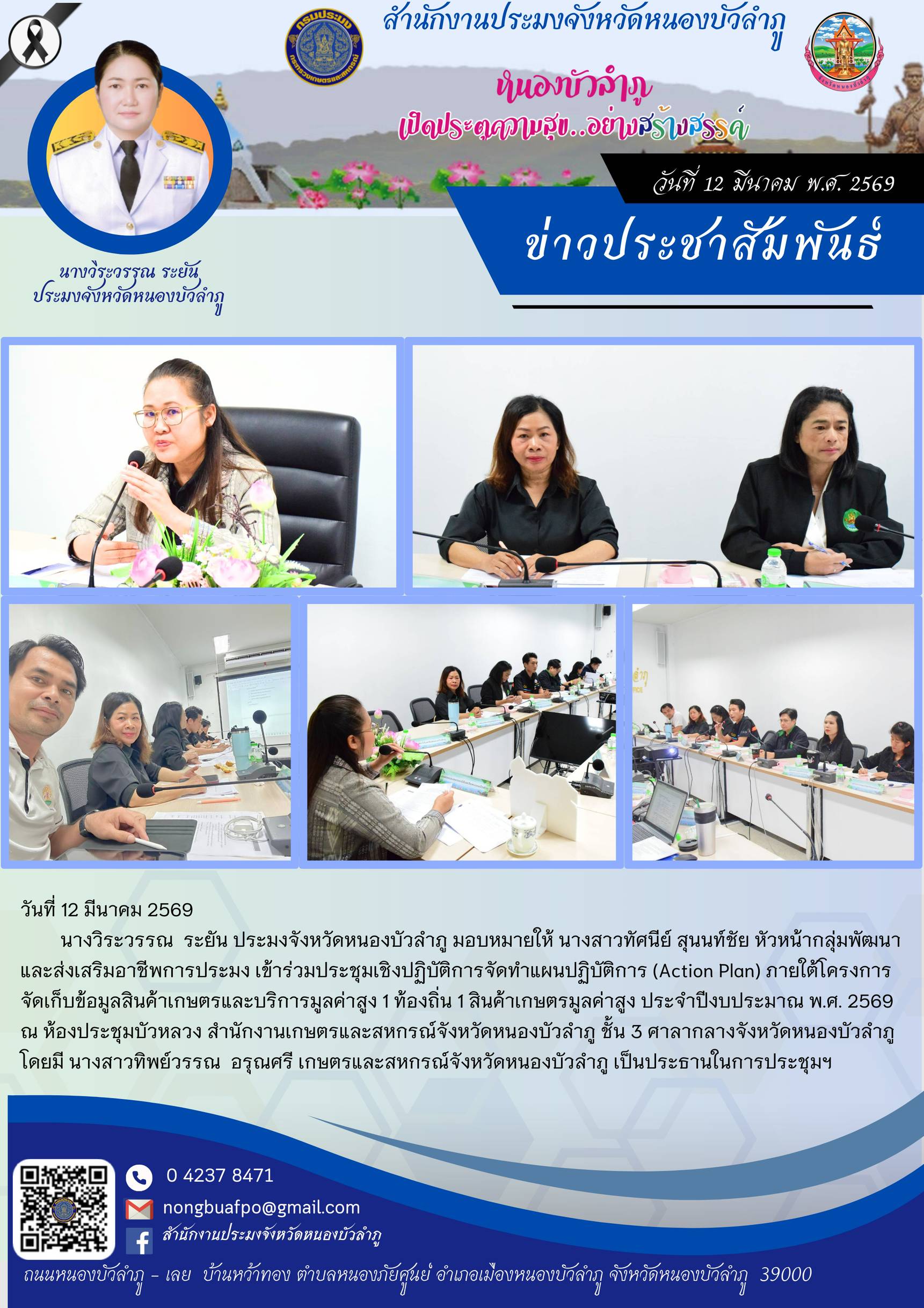 นางวิระวรรณ ระยัน ประมงจังหวัดหนองบัวลำภู มอบหมายให้ นางสาวทัศนีย์ สุนนท์ชัย หัวหน้ากลุ่มพัฒนาและส่งเสริมอาชีพการประมง เข้าร่วมประชุมเชิงปฏิบัติการจัดทำแผนปฏิบัติการ (Action Plan) ภายใต้โครงการ จัดเก็บข้อมูลสินค้าเกษตรและบริการมูลค่าสูง 1 ท้องถิ่น 1 สินค้าเกษตรมูลค่าสูง ประจำปีงบประมาณ พ.ศ. 2569 ณ ห้องประชุมบัวหลวง สำนักงานเกษตรและสหกรณ์จังหวัดหนองบัวลำภู ชั้น 3 ศาลากลางจังหวัดหนองบัวลำภู โดยมี นางสาวทิพย์วรรณ อรุณศรี เกษตรและสหกรณ์จังหวัดหนองบัวลำภู เป็นประธานในการประชุมฯ