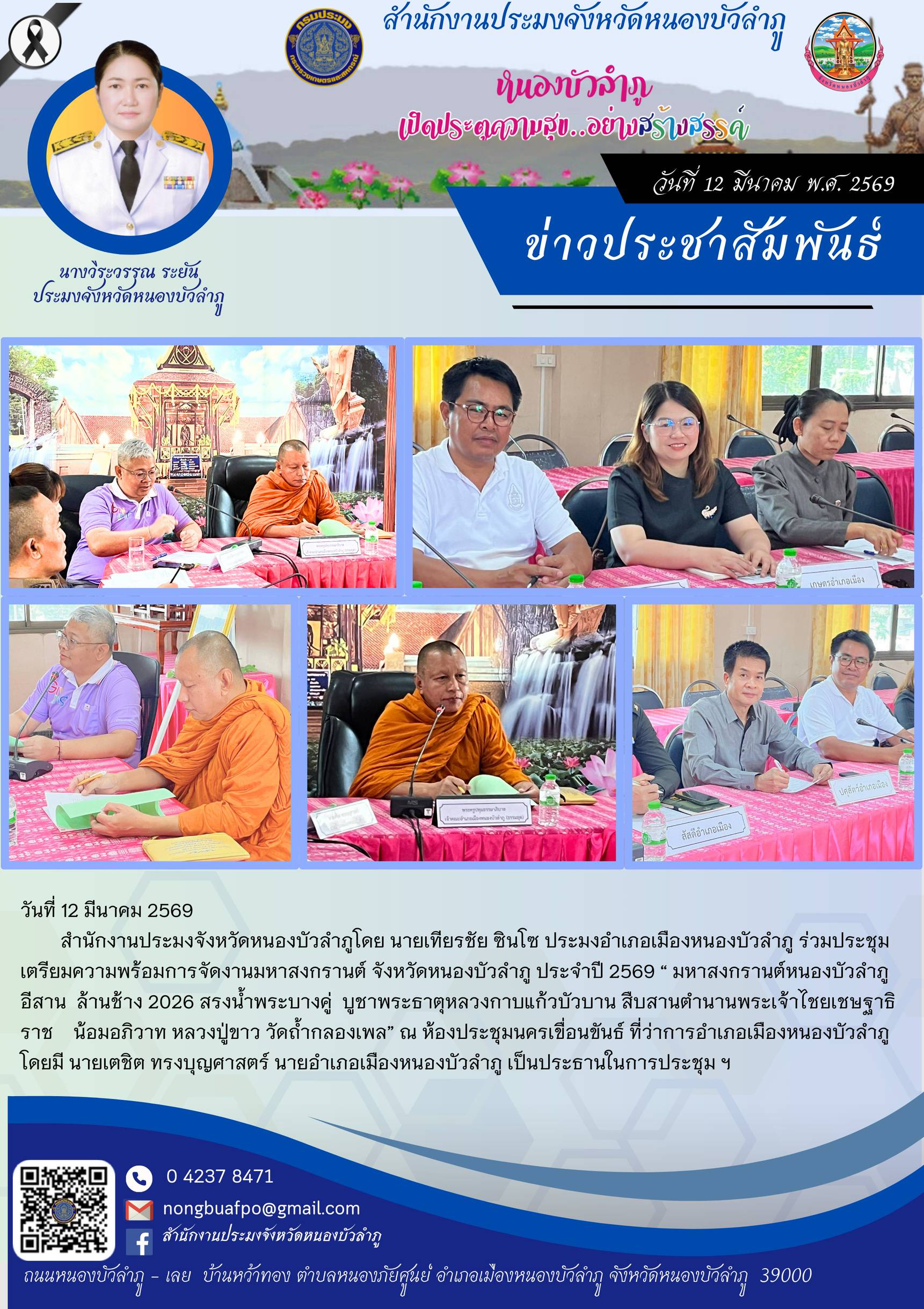 NEW ร่วมประชุมเตรียมความพร้อมการจัดงานมหาสงกรานต์ จังหวัดหนองบัวลำภู ประจำปี 2569 “ มหาสงกรานต์หนองบัวลำภูอีสาน ล้านช้าง 2026 สรงน้ำพระบางคู่ บูชาพระธาตุหลวงกาบแก้วบัวบาน สืบสานตำนานพระเจ้าไชยเชษฐาธิราช น้อมอภิวาท หลวงปู่ขาว วัดถ้ำกลองเพล”..คลิก
