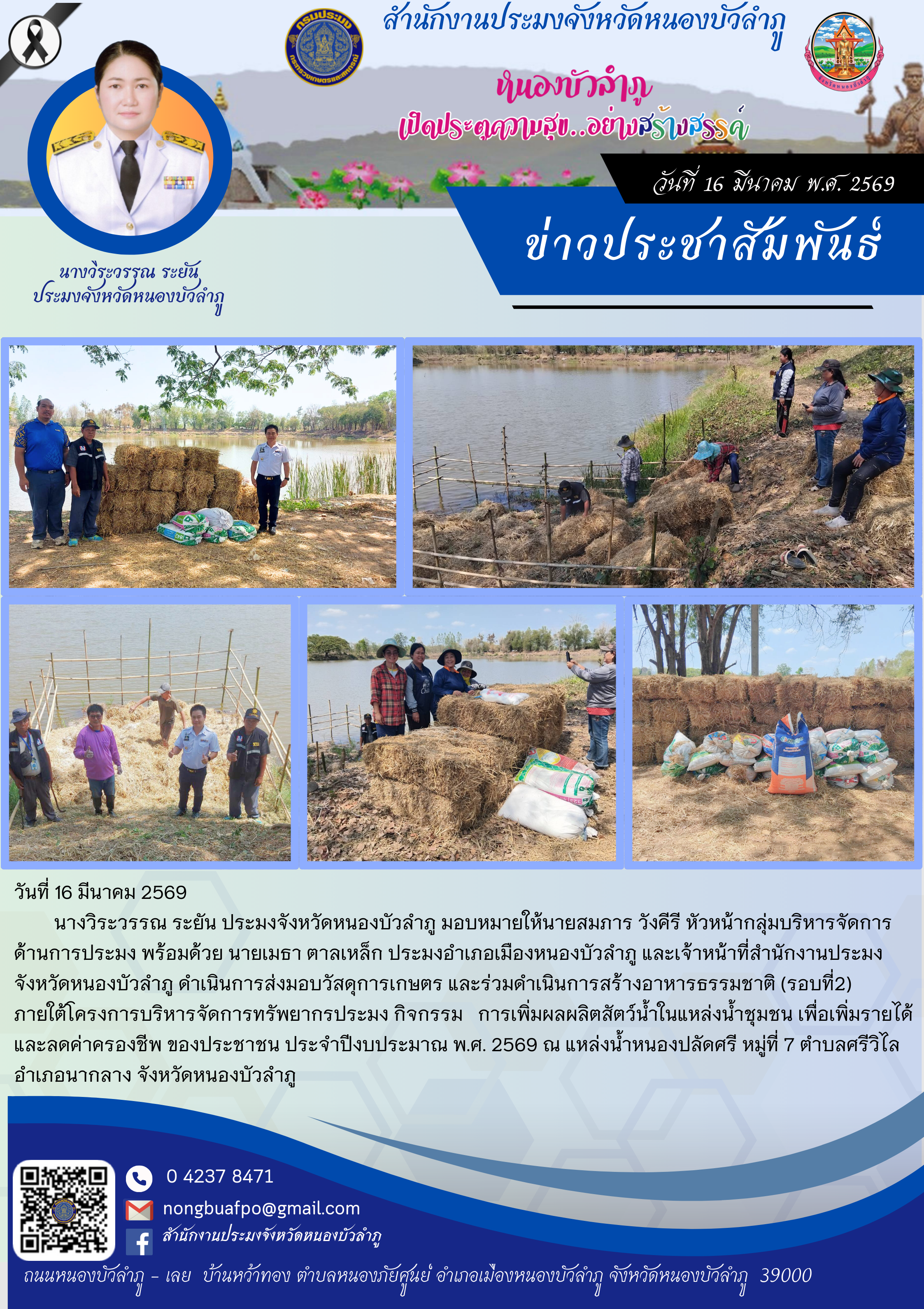 นางวิระวรรณ ระยัน ประมงจังหวัดหนองบัวลำฏ มอบหมายให้นายสมภาร วังคีรี หัวหน้ากลุ่มบริหารจัดการ ด้านการประมง พร้อมด้วย นายเมธา ตาลเหล็ก ประมงอำเภอเมืองหนองบัวลำภู และเจ้าหน้าที่สำนักงานประมง จังหวัดหนองบัวลำภู ดำเนินการส่งมอบวัสดุการเกษตร และร่วมดำเนินการสร้างอาหารธรรมชาติ (รอบที่ 2) ภายใต้โครงการบริหารจัดการทรัพยากรประมง กิจกรรม การเพิ่มผลผลิตสัตว์น้ำในแหล่งน้ำชุมชน เพื่อเพิ่มรายได้และลดค่าครองชีพ ของประชาชน ประจำปีงบประมาณ พ.ศ. 2569 ณ แหล่งน้ำหนองปลัดศรี หมู่ที่ 7 ตำบลศรีวิไล อำเภอนากลาง จังหวัดหนองบัวลำภู