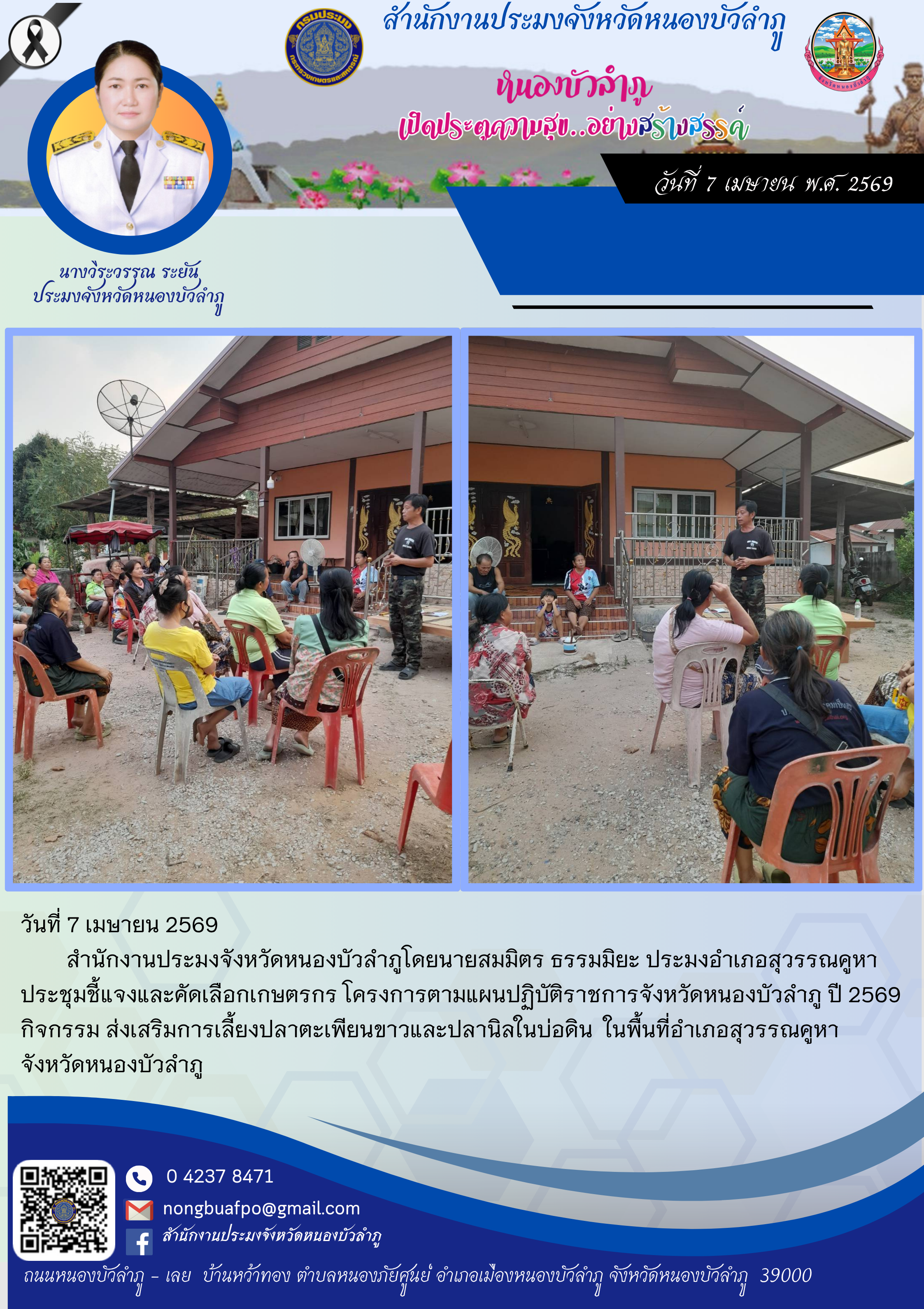 สำนักงานประมงจังหวัดหนองบัวลำภูโดยนายสมมิตร ธรรมมิยะ ประมงอำเภอสุวรรณคูหา ประชุมชี้แจงและคัดเลือกเกษตรกร โครงการตามแผนปฏิบัติราชการจังหวัดหนองบัวลำภู ปี 2569 กิจกรรม ส่งเสริมการเลี้ยงปลาตะเพียนขาวและปลานิลในบ่อดิน ในพื้นที่อำเภอสุวรรณคูหา จังหวัดหนองบัวลำภู