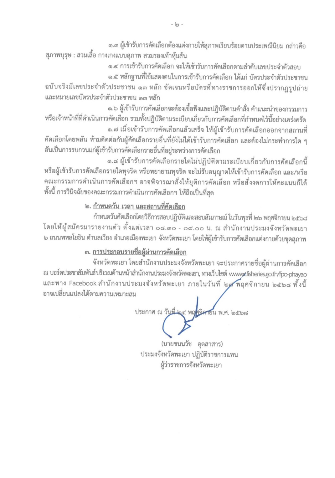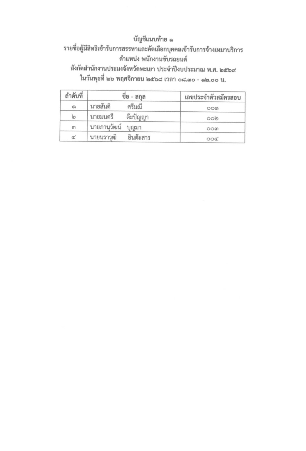 ประกาศจังหวัดพะเยา เรื่อง ประกาศรายชื่อผู้มีสิทธิเข้ารับการสรรหาและคัดเลือกบุคคลเข้ารับการจ้างเหมาบริการ ตำแหน่ง พนักงานขับรถยนต์ สังกัดสำนักงานประมงจังหวัดพะเยา ประจำปีงบประมาณ พ.ศ. 2569