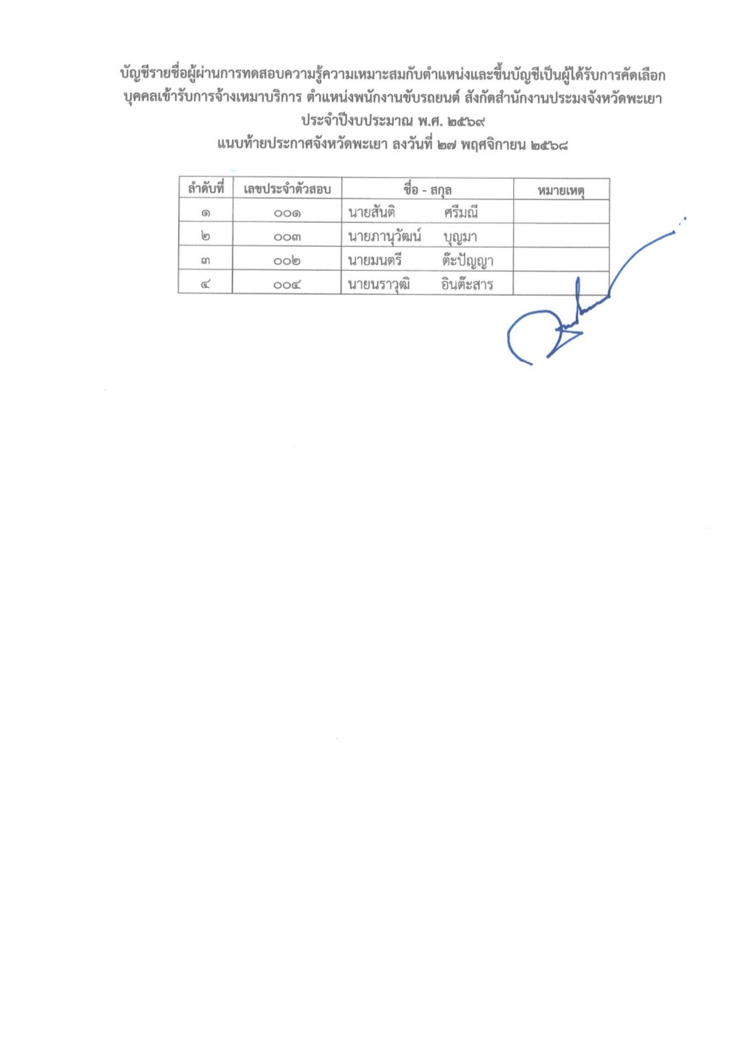 ประกาศรายชื่อผู้ผ่านการสรรหาและคัดเลือกบุคคลเข้ารับ การจ้างเหมาบริการ ตำแหน่ง พนักงานขับรถยนต์ สังกัดสำนักงานประมงจังหวัดพะเยา ประจำปีงบประมาณ พ.ศ. 2569