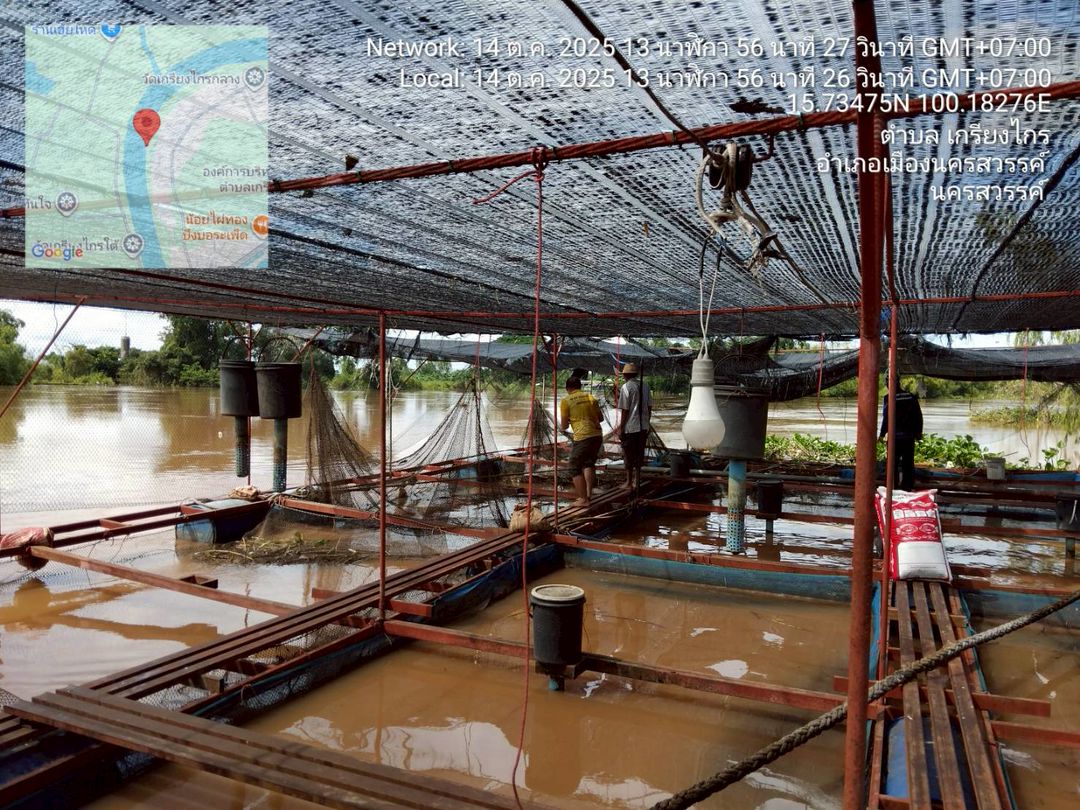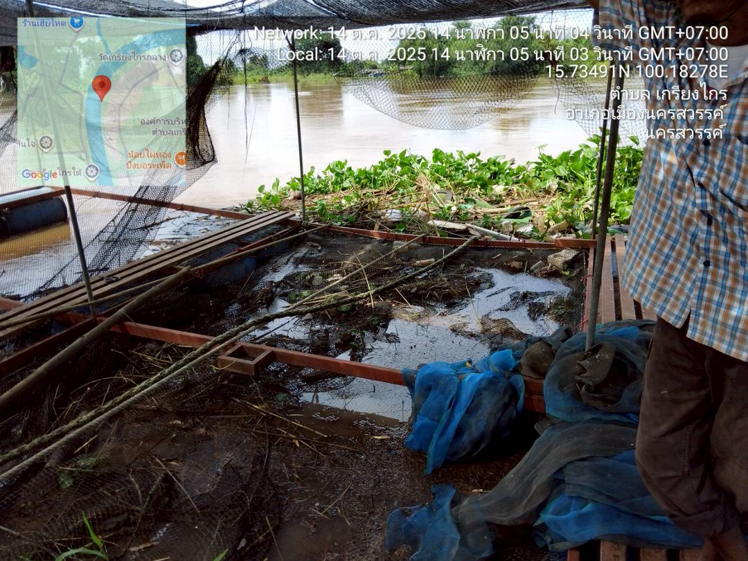 วันอังคารที่ 14 ตุลาคม 2568 เวลา 13.00 น. นายวชิระ กว้างขวาง ประมงจังหวัดนครสวรรค์ มอบหมายให้นางสาวศรีไพร อ้นเกษ ประมงอำเภอเมืองนครสวรรค์ พร้อมด้วย นายมารุต เครือภู่ นักวิชาการประมงปฏิบัติการ ร่วมกับผู้ใหญ่บ้านและผู้ช่วยผู้ใหญ่บ้าน ตรวจสอบกระชังปลาที่ได้รับผลกระทบจากอุทกภัย หลังจากได้รับแจ้งจากผู้ใหญ่บ้านว่า มีปลาในกระชังตายเป็นจำนวนมาก จากการตรวจสอบพบว่าสาเหตุการตายอาจเกิดจากคุณภาพน้ำที่เปลี่ยนแปลงโดยฉับพลัน เนื่องจากกระชังตั้งอยู่ใกล้บริเวณปากคลองเกรียงไกร ทำให้ปลาไม่สามารถปรับสภาพได้ ส่งผลให้ปลาอ่อนแอ และตายเป็นจำนวนมากในช่วงประมาณ 1-2 วันแรก และจากนั้นก็กลับสู่สภาวะปกติ หมู่ 5 ตำบลเกรียงไกร อำเภอเมืองนครสวรรค์ จังหวัดนครสวรรค์
