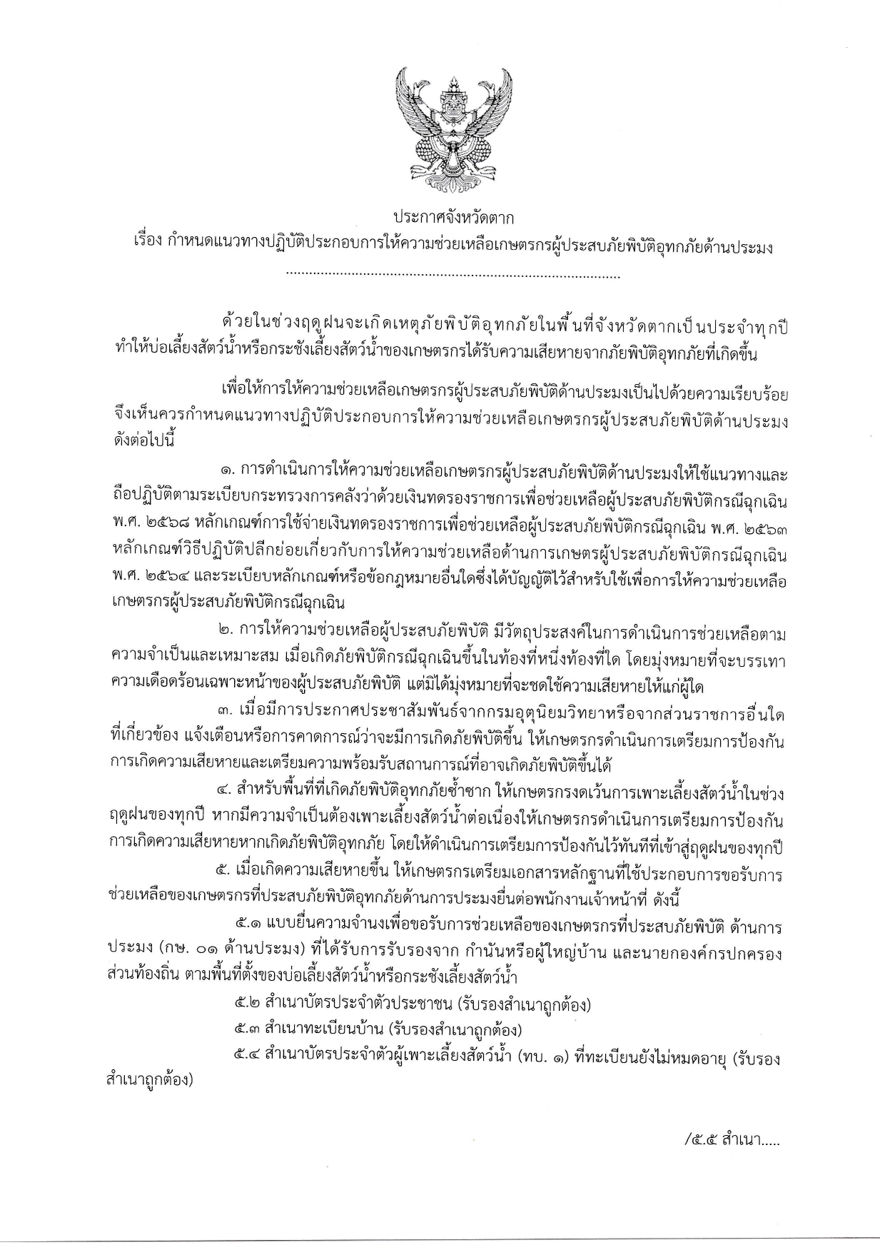 ประกาศจังหวัดตาก เรื่อง กำหนดแนวทางปฏิบัติประกอบการให้ความช่วยเหลือเกษตรกรผู้ประสบภัยพิบัติอุทกภัยด้านประมง