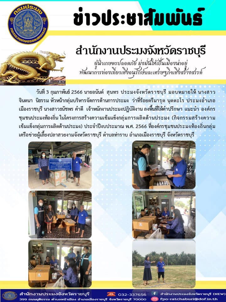 วันที่ 3 กุมภาพันธ์ 2566 นายอนันต์ สุนทร ประมงจังหวัดราชบุรี มอบหมายให้ นางสาวจินตนา นิธรรม หัวหน้ากลุ่มบริหารจัดการด้านการประมง ว่าที่ร้อยตรีมารุต นุตตะโร ประมงอำเภอเมืองราชบุรี นางสาวธนัชพร คำดี เจ้าพนักงานประมงปฎิบัติงาน ลงพื้นที่ให้คำปรึกษา แนะนำ องค์กรชุมชนประมงท้องถิ่น ในโครงการสร้างความเข้มแข็งกลุ่มการผลิตด้านประมง (กิจกรรมสร้างความเข้มแข็งกลุ่มการผลิตด้านประมง) ประจำปีงบประมาณ พ.ศ. 2566 ที่องค์กรชุมชนประมงท้องถิ่นกลุ่มเครือข่ายผู้เลี้ยงปลาสวยงามจังหวัดราชบุรี ตำบลท่าราบ อำเภอเมืองราชบุรี จังหวัดราชบุรี