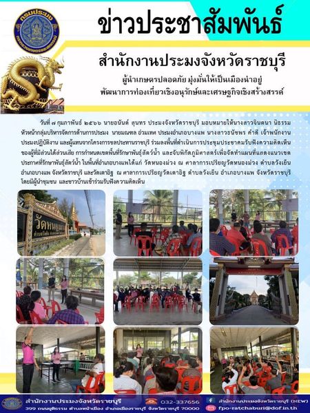 วันที่ 7 กุมภาพันธ์ 2566 นายอนันต์ สุนทร ประมงจังหวัดราชบุรี มอบหมายให้ นางสาวจินตนา นิธรรม หัวหน้ากลุ่มบริหารจัดการด้านการประมง นายมณฑล อ่วมเทศ ประมงอำเภอบางแพ นางสาวธนัชพร คำดี เจ้าพนักงานประมงปฏิบัติงาน และผู้แทนจากโครงการชลประทานราชบุรี ร่วมลงพื้นที่ดำเนินการประชุมประชาคมรับฟังความคิดเห็นของผู้ที่มีส่วนได้ส่วนเสีย การกำหนดเขตพื้นที่รักษาพันธุ์สัตว์น้ำ และจับพิกัดภูมิศาสตร์เพื่อจัดทำแผนที่แสดงแนวเขตประกาศที่รักษาพันธุ์สัตว์น้ำ ในพื้นที่อำเภอบางแพได้แก่ วัดหนองม่วง ณ ศาลาการเปรียญวัดหนองม่วง ตำบลวังเย็น อำเภอบางแพ จังหวัดราชบุรี และวัดเตาอิฐ ณ ศาลาการเปรียญวัดเตาอิฐ ตำบลวังเย็น อำเภอบางแพ จังหวัดราชบุรี โดยมีผู้นำชุมชน และชาวบ้านเข้าร่วมรับฟังความคิดเห็น