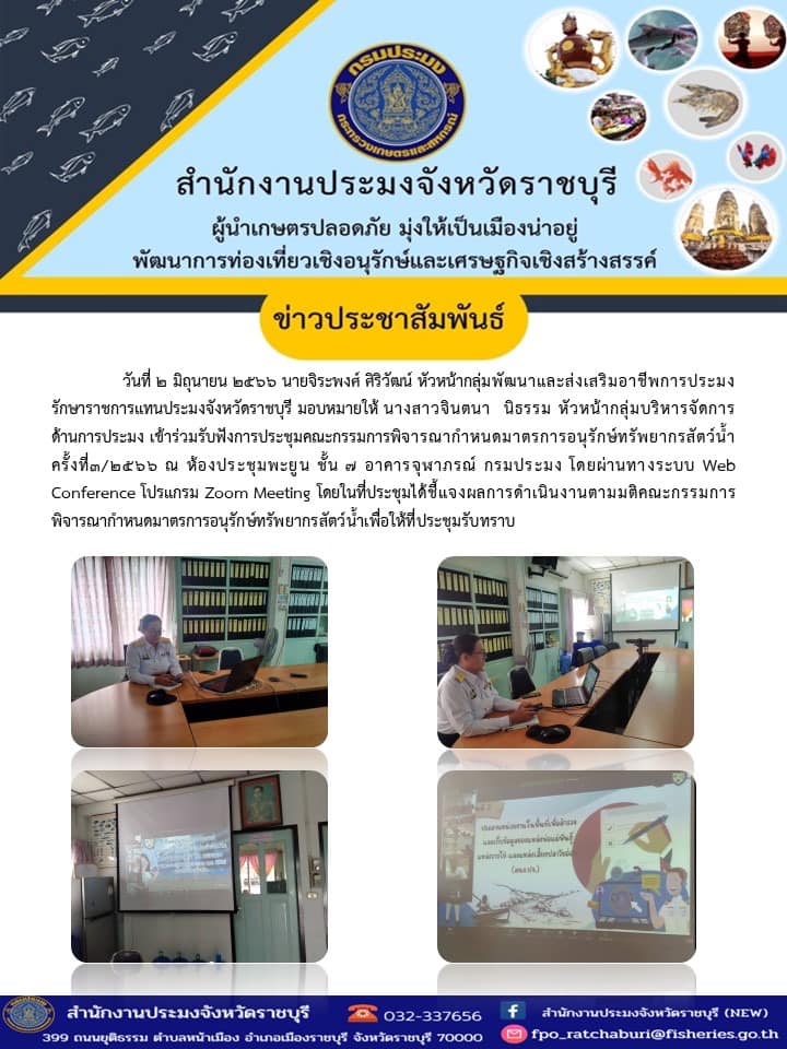 วันที่ 2 มิถุนายน 2566 นายจิระพงศ์ ศิริวัฒน์ หัวหน้ากลุ่มพัฒนาและส่งเสริมอาชีพการประมง รักษาราชการแทนประมงจังหวัดราชบุรี มอบหมายให้ นางสาวจินตนา นิธรรม หัวหน้ากลุ่มบริหารจัดการด้านการประมง เข้าร่วมรับฟังการประชุมคณะกรรมการพิจารณากำหนดมาตรการอนุรักษ์ทรัพยากรสัตว์น้ำ ครั้งที่3/2566 ณ ห้องประชุมพะยูน ชั้น 7 อาคารจุฬาภรณ์ กรมประมง โดยผ่านทางระบบ Web Conference โปรแกรม Zoom Meeting โดยในที่ประชุมได้ชี้แจงผลการดำเนินงานตามมติคณะกรรมการพิจารณากำหนดมาตรการอนุรักษ์ทรัพยากรสัตว์น้ำเพื่อให้ที่ประชุมรับทราบ