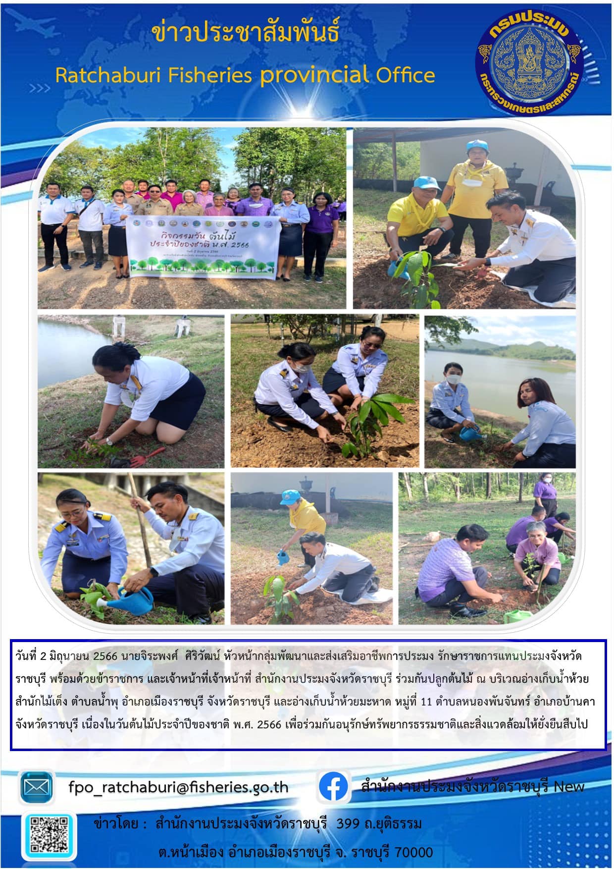 วันที่ 2 มิถุนายน 2566 นายจิระพงศ์ ศิริวัฒน์ หัวหน้ากลุ่มพัฒนาและส่งเสริมอาชีพการประมง รักษาราชการแทนประมงจังหวัดราชบุรี พร้อมด้วย ข้าราชการ และเจ้าหน้าที่เจ้าหน้าที่ สำนักงานประมงจังหวัดราชบุรี ร่วมกันปลูกต้นไม้ ณ บริเวณอ่างเก็บน้ำห้วยสำนักไม้เต็ง ตำบลน้ำพุ อำเภอเมืองราชบุรี จังหวัดราชบุรี และอ่างเก็บน้ำห้วยมะหาด หมู่ที่ 11 ตำบลหนองพันจันทร์ อำเภอบ้านคา จังหวัดราชบุรี เนื่องในวันต้นไม้ประจำปีของชาติ พ.ศ. 2566 เพื่อร่วมกันอนุรักษ์ทรัพยากรธรรมชาติและสิ่งแวดล้อมให้ยั่งยืนสืบไป