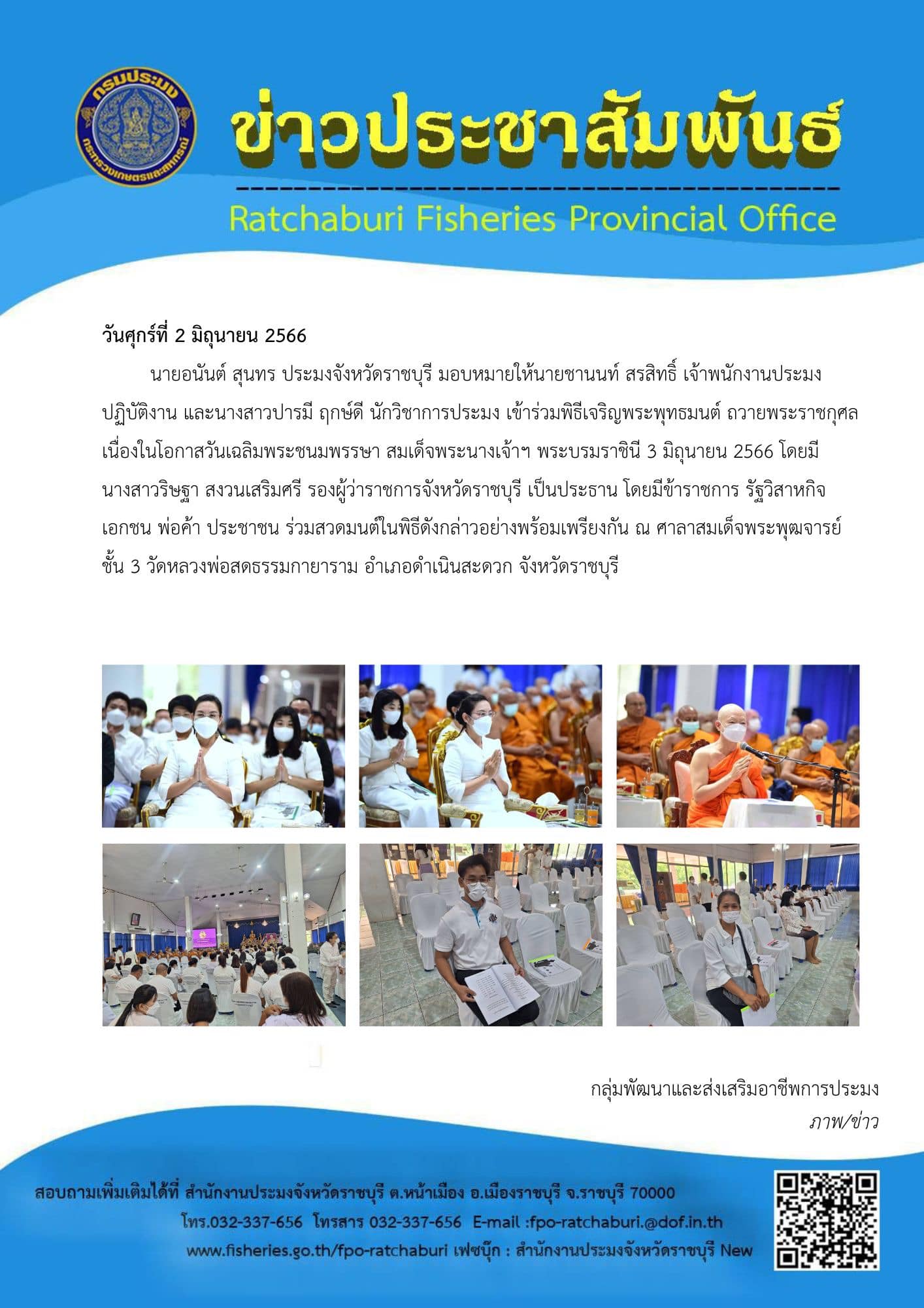 วันศุกร์ที่ 2 มิถุนายน 2566 นายอนันต์ สุนทร ประมงจังหวัดราชบุรี มอบหมายให้นายชานนท์ สรสิทธิ์ เจ้าพนักงานประมงปฏิบัติงาน และนางสาวปารมี ฤกษ์ดี นักวิชาการประมง เข้าร่วมพิธีเจริญพระพุทธมนต์ ถวายพระราชกุศล เนื่องในโอกาสวันเฉลิมพระชนมพรรษา สมเด็จพระนางเจ้าฯ พระบรมราชินี 3 มิถุนายน 2566 โดยมี นางสาววริษฐา สงวนเสริมศรี รองผู้ว่าราชการจังหวัดราชบุรี เป็นประธาน โดยมีข้าราชการ รัฐวิสาหกิจ เอกชน พ่อค้า ประชาชน ร่วมสวดมนต์ในพิธีดังกล่าวอย่างพร้อมเพรียงกัน ณ ศาลาสมเด็จพระพุฒจารย์ ชั้น 3 วัดหลวงพ่อสดธรรมกายาราม อำเภอดำเนินสะดวก จังหวัดราชบุรี
