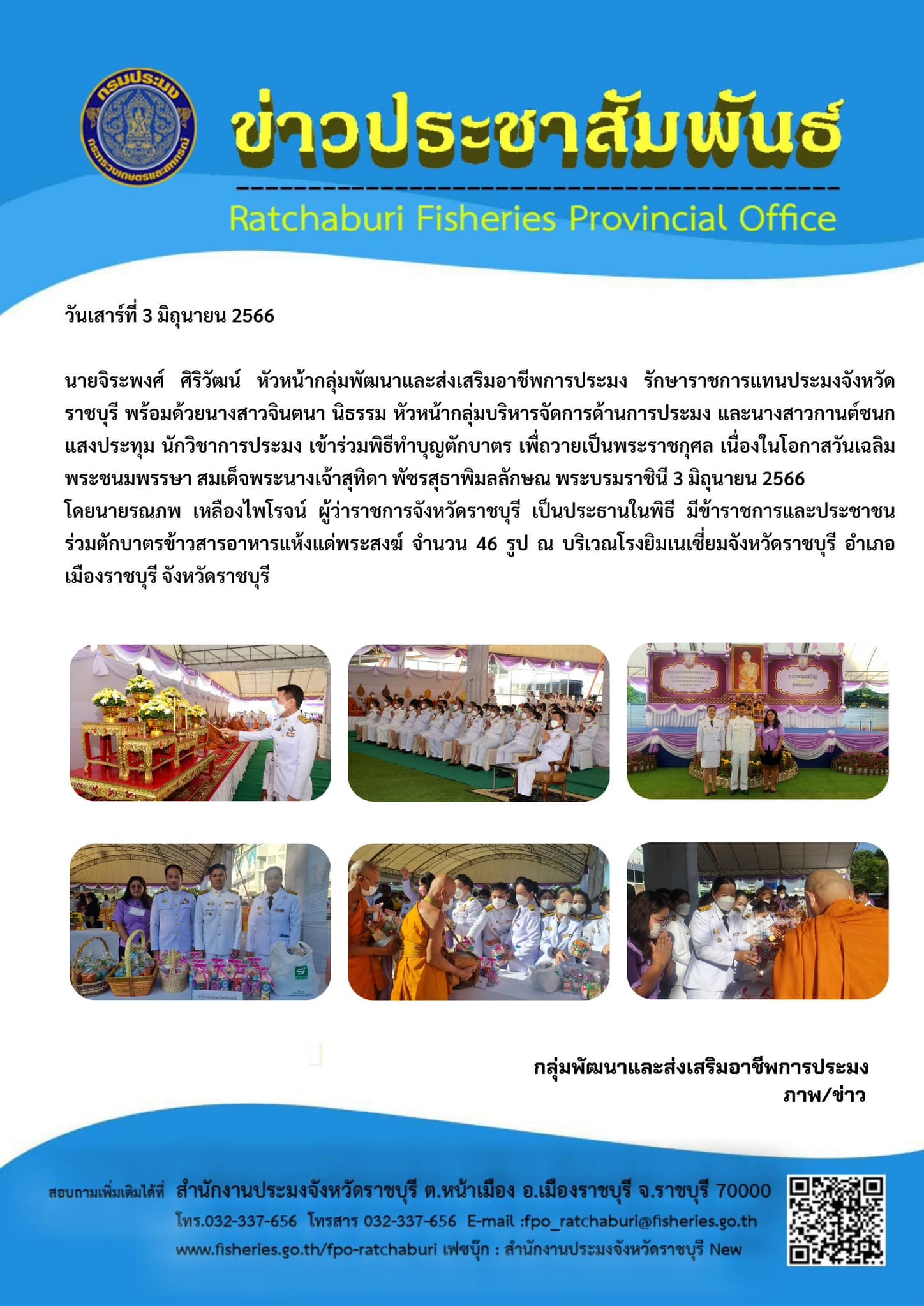 วันเสาร์ที่ 3 มิถุนายน 2566 นายจิระพงศ์ ศิริวัฒน์ หัวหน้ากลุ่มพัฒนาและส่งเสริมอาชีพการประมง รักษาราชการแทนประมงจังหวัดราชบุรี พร้อมด้วย นางสาวจินตนา นิธรรม หัวหน้ากลุ่มบริหารจัดการด้านการประมง และนางสาวกานต์ชนก แสงประทุม นักวิชาการประมง เข้าร่วมพิธีทำบุญตักบาตร เพื่ถวายเป็นพระราชกุศล เนื่องในโอกาสวันเฉลิมพระชนมพรรษา สมเด็จพระนางเจ้าสุทิดา พัชรสุธาพิมลลักษณ พระบรมราชินี 3 มิถุนายน 2566 โดยนายรณภพ เหลืองไพโรจน์ ผู้ว่าราชการจังหวัดราชบุรี เป็นประธานในพิธี มีข้าราชการและประชาชน ร่วมตักบาตรข้าวสารอาหารแห้งแด่พระสงฆ์ จำนวน 46 รูป ณ บริเวณโรงยิมเนเซี่ยมจังหวัดราชบุรี อำเภอเมืองราชบุรี จังหวัดราชบุรี