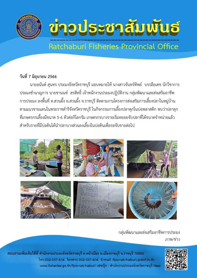 วันที่ 7 มิถุนายน 2566 นายอนันต์ สุนทร ประมงจังหวัดราชบุรี มอบหมายให้ นางสาวจันทร์ทิพย์ บรรลือเดช นักวิชาการประมงชำนาญการ นายชานนท์ สรสิทธิ์ เจ้าพนักงานประมงปฏิบัติงาน กลุ่มพัฒนาและส่งเสริมอาชีพการประมง ลงพื้นที่ ตำบลสวนผึ้ง อำเภอสวนผึ้ง จังหวัดราชบุรี ติดตามงานโครงการส่งเสริมการเลี้ยงปลาในหมู่บ้านตามแนวชายแดนในพระราชดำริจังหวัดราชบุรี ในกิจกรรมการเลี้ยงปลาดุกในบ่อพลาสติก พบว่าปลาดุกที่เกษตรกรเลี้ยงมีขนาด 5-6 ตัว ต่อ กิโลกรัม เกษตรกรบางรายเริ่มทยอยจับปลาที่ได้ขนาดจำหน่ายแล้ว สำหรับรายที่มีบ่อดินได้นำปลาบางส่วนลงเลี้ยงในบ่อดินเพื่อรอจับขายต่อไป