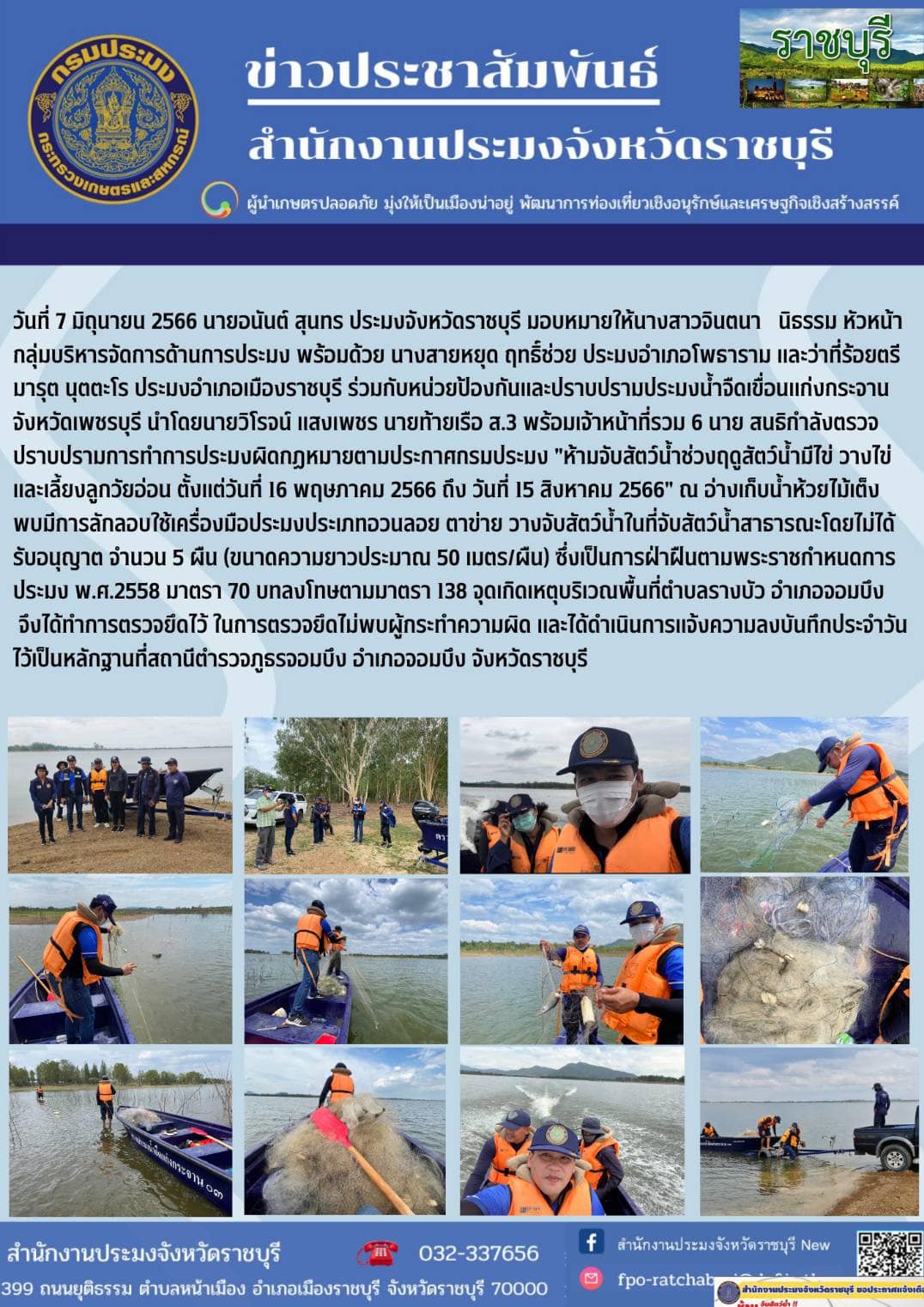 วันที่ 7 มิถุนายน 2566 นายอนันต์ สุนทร ประมงจังหวัดราชบุรี มอบหมายให้นางสาวจินตนา นิธรรม หัวหน้ากลุ่มบริหารจัดการด้านการประมง พร้อมด้วย นางสายหยุด ฤทธิ์ช่วย ประมงอำเภอโพธาราม และว่าที่ร้อยตรี มารุต นุตตะโร ประมงอำเภอเมืองราชบุรี ร่วมกับหน่วยป้องกันและปราบปรามประมงน้ำจืดเขื่อนแก่งกระจาน จังหวัดเพชรบุรี นำโดยนายวิโรจน์ แสงเพชร นายท้ายเรือ ส.3 พร้อมเจ้าหน้าที่รวม 6 นาย สนธิกำลังตรวจปราบปรามการทำการประมงผิดกฏหมายตามประกาศกรมประมง "ห้ามจับสัตว์น้ำช่วงฤดูสัตว์น้ำมีไข่ วางไข่ และเลี้ยงลูกวัยอ่อน ตั้งแต่วันที่ 16 พฤษภาคม 2566 ถึง วันที่ 15 สิงหาคม 2566"ณ อ่างเก็บน้ำห้วยไม้เต็ง พบมีการลักลอบใช้เครื่องมือประมงประเภทอวนลอย ตาข่าย วางจับสัตว์น้ำในที่จับสัตว์น้ำสาธารณะโดยไม่ได้รับอนุญาต จำนวน 5 ผืน (ขนาดความยาวประมาณ 50 เมตร/ผืน) ซึ่งเป็นการฝ่าฝืนตามพระราชกำหนดการประมง พ.ศ.2558 มาตรา 70 บทลงโทษตามมาตรา 138 จุดเกิดเหตุบริเวณพื้นที่ตำบลรางบัว อำเภอจอมบึง จึงได้ทำการตรวจยึดไว้ ในการตรวจยึดไม่พบผู้กระทำความผิด และได้ดำเนินการแจ้งความลงบันทึกประจำวันไว้เป็นหลักฐานที่สถานีตำรวจภูธรจอมบึง อำเภอจอมบึง จังหวัดราชบุรี