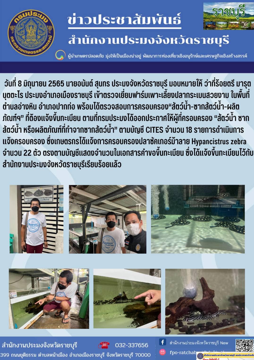 วันที่ 8 มิถุนายน 2565 นายอนันต์ สุนทร ประมงจังหวัดราชบุรี มอบหมายให้ ว่าที่ร้อยตรี มารุต นุตตะโร ประมงอำเภอเมืองราชบุรี เข้าตรวจเยี่ยมฟาร์มเพาะเลี้ยงปลากระเบนสวยงาม ในพื้นที่ตำบลอ่างหิน อำเภอปากท่อ พร้อมได้ตรวจสอบการครอบครอง“สัตว์น้ำ-ซากสัตว์น้ำ-ผลิตภัณฑ์ฯ” ที่ต้องแจ้งขึ้นทะเบียน ตามที่กรมประมงได้ออกประกาศให้ผู้ที่ครอบครอง “สัตว์น้ำ ซากสัตว์น้ำ หรือผลิตภัณฑ์ที่ทำจากซากสัตว์น้ำ” ตามบัญชี CITES จำนวน 18 รายการดำเนินการแจ้งครอบครอง ซึ่งเกษตรกรได้แจ้งการครอบครองปลาซัคเกอร์ม้าลาย Hypancistrus zebra จำนวน 22 ตัว ตรงตามบัญชีแสดงจำนวนในเอกสารคำขอขึ้นทะเบียน ซึ่งได้แจ้งขึ้นทะเบียนไว้กับสำนักงานประมงจังหวัดราชบุรีเรียบร้อยแล้ว