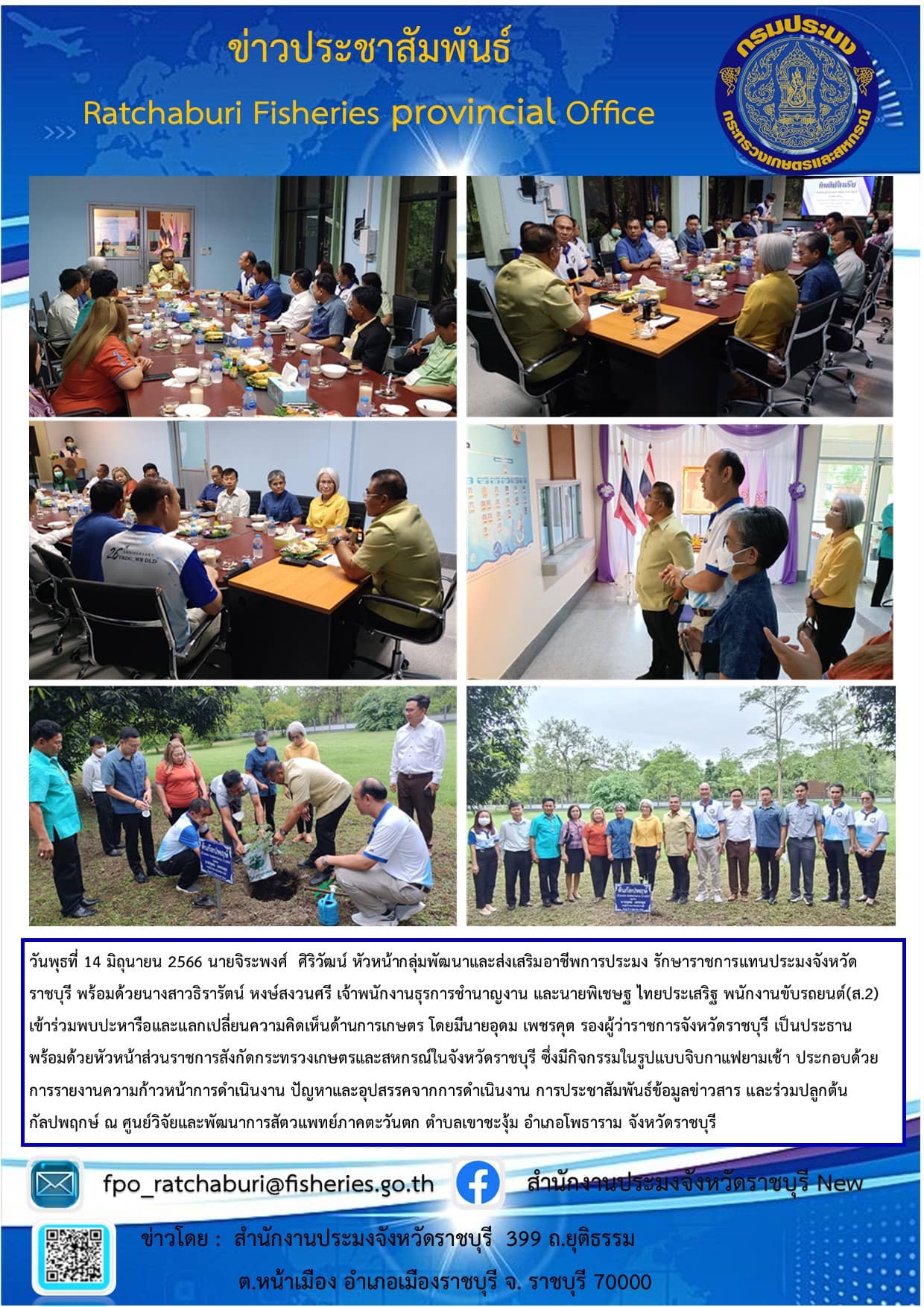 วันพุธที่ 14 มิถุนายน 2566 นายจิระพงศ์ ศิริวัฒน์ หัวหน้ากลุ่มพัฒนาและส่งเสริมอาชีพการประมง รักษาราชการแทนประมงจังหวัดราชบุรี พร้อมด้วย นางสาวธิรารัตน์ หงษ์สงวนศรี เจ้าพนักงานธุรการชำนาญงาน และนายพิเชษฐ ไทยประเสริฐ พนักงานขับรถยนต์ (ส.2) เข้าร่วมพบปะหารือและแลกเปลี่ยนความคิดเห็นด้านการเกษตร โดยมีนายอุดม เพชรคุต รองผู้ว่าราชการจังหวัดราชบุรี เป็นประธาน พร้อมด้วยหัวหน้าส่วนราชการสังกัดกระทรวงเกษตรและสหกรณ์ในจังหวัดราชบุรี ซึ่งมีกิจกรรมในรูปแบบจิบกาแฟยามเช้า ประกอบด้วย การรายงานความก้าวหน้าการดำเนินงาน ปัญหาและอุปสรรคจากการดำเนินงาน การประชาสัมพันธ์ข้อมูลข่าวสาร และร่วมปลูกต้นกัลปพฤกษ์ ณ ศูนย์วิจัยและพัฒนาการสัตวแพทย์ภาคตะวันตก ตำบลเขาชะงุ้ม อำเภอโพธาราม จังหวัดราชบุรี