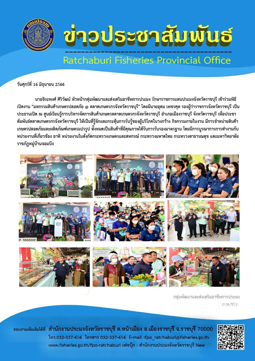วันศุกร์ที่ 16 มิถุนายน 2566 นายจิระพงศ์ ศิริวัฒน์ หัวหน้ากลุ่มพัฒนาและส่งเสริมอาชีพการประมง รักษาราชการแทนประมงจังหวัดราชบุรี เข้าร่วมพิธี เปิดงาน "มหกรรมสินค้าเกษตรปลอดภัย @ ตลาดเกษตรกรจังหวัดราชบุรี" โดยมี นายอุดม เพชรคุต รองผู้ว่าราชการจังหวัดราชบุรี เป็น ประธานเปิด ณ ศูนย์เรียนรู้การบริหารจัดการสินค้าเกษตรตลาดเกษตรกรจังหวัดราชบุรี อำเภอเมืองราชบุรี จังหวัดราชบุรี เพื่อประชาสัมพันธ์ตลาดเกษตรกรจังหวัดราชบุรี ให้เป็นที่รู้จักและกระตุ้นการรับรู้ของผู้บริโภคในวงกว้าง กิจกรรมภายในงาน มีการจำหน่ายสินค้าเกษตรปลอดภัยและผลิตภัณฑ์เกษตรแปรรูป ทั้งหมดเป็นสินค้าที่มีคุณภาพได้รับการรับรองมาตรฐาน โดยมีการบูรณาการการทำงานกับหน่วยงานที่เกี่ยวข้อง อาทิ หน่วยงานในสังกัดกระทรวงเกษตรและสหกรณ์ กระทรวงมหาดไทย กระทรวงสาธารณสุข และมหาวิทยาลัยราชภัฏหมู่บ้านจอมบึง
