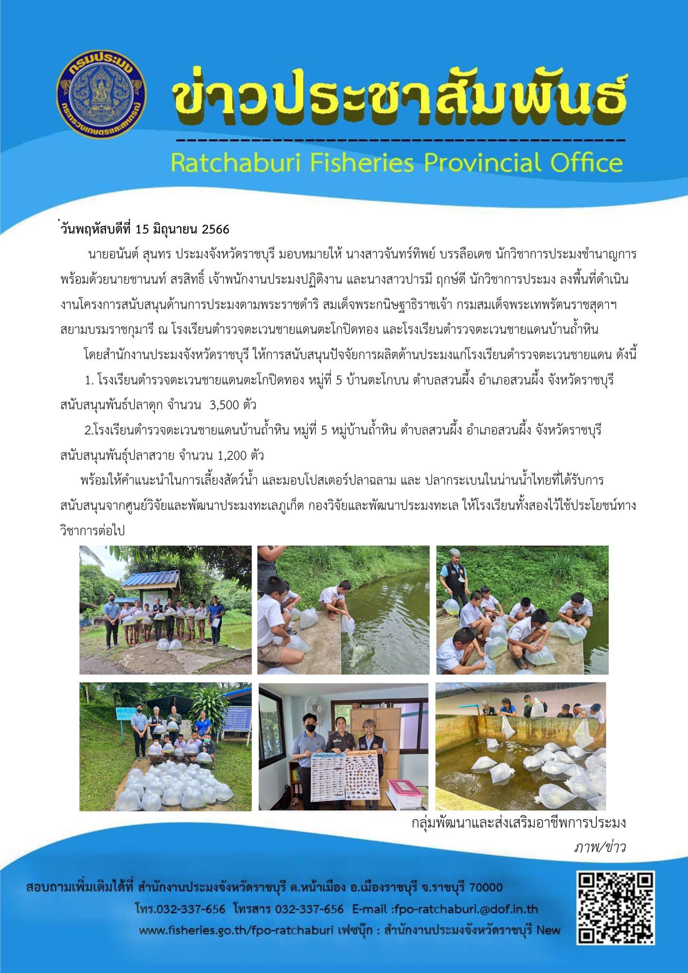 วันพฤหัสบดีที่ 15 มิถุนายน 2566 นายอนันต์ สุนทร ประมงจังหวัดราชบุรี มอบหมายให้ นางสาวจันทร์ทิพย์ บรรลือเดช นักวิชาการประมงชำนาญการ พร้อมด้วย นายชานนท์ สรสิทธิ์ เจ้าพนักงานประมงปฏิติงาน และนางสาวปารมี ฤกษ์ดี นักวิชาการประมง ลงพื้นที่ดำเนินงานโครงการสนับสนุนด้านการประมงตามพระราชดำริ สมเด็จพระกนิษฐาธิราชเจ้า กรมสมเด็จพระเทพรัตนราชสุดาฯ สยามบรมราชกุมารี ณ โรงเรียนตำรวจตะเวนชายแดนตะโกปิดทอง และโรงเรียนตำรวจตะเวนชายแดนบ้านถ้ำหิน โดยสำนักงานประมงจังหวัดราชบุรี ให้การสนับสนุนปัจจัยการผลิตด้านประมงแก่โรงเรียนตำรวจตะเวนชายแดน ดังนี้