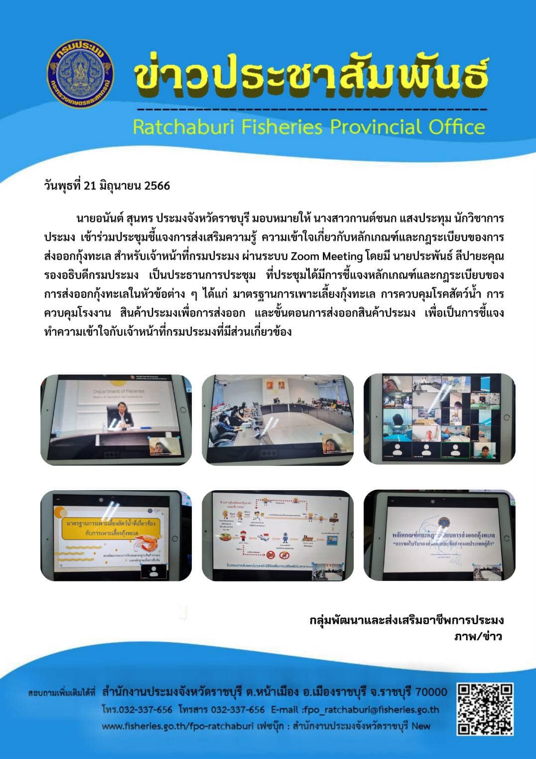วันพุธที่ 21 มิถุนายน 2566 นายอนันต์ สุนทร ประมงจังหวัดราชบุรี มอบหมายให้ นางสาวกานต์ชนก แสงประทุม นักวิชาการประมง เข้าร่วมประชุมชี้แจงการส่งเสริมความรู้ ความเข้าใจเกี่ยวกับหลักเกณฑ์และกฎระเบียบของการส่งออกกุ้งทะเล สำหรับเจ้าหน้าที่กรมประมง ผ่านระบบ Zoom Meeting โดยมี นายประพันธ์ ลีปายะคุณ รองอธิบดีกรมประมง เป็นประธานการประชุม ที่ประชุมได้มีการชี้แจงหลักเกณฑ์และกฎระเบียบของการส่งออกกุ้งทะเลในหัวข้อต่าง ๆ ได้แก่ มาตรฐานการเพาะเลี้ยงกุ้งทะเล การควบคุมโรคสัตว์น้ำ การควบคุมโรงงาน สินค้าประมงเพื่อการส่งออก และขั้นตอนการส่งออกสินค้าประมง เพื่อเป็นการชี้แจง ทำความเข้าใจกับเจ้าหน้าที่กรมประมงที่มีส่วนเกี่ยวข้อง