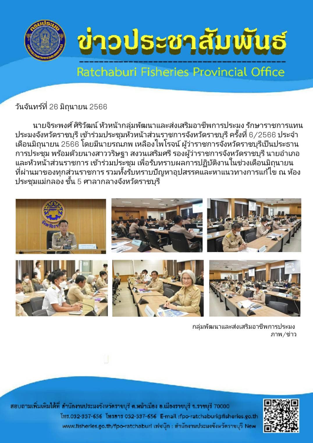 วันจันทร์ที่ 26 มิถุนายน 2566 นายจิระพงศ์ ศิริวัฒน์ หัวหน้ากลุ่มพัฒนาและส่งเสริมอาชีพการประมง รักษาราชการแทนประมงจังหวัดราชบุรี เข้าร่วมประชุมหัวหน้าส่วนราชการจังหวัดราชบุรี ครั้งที่ 6/2566 ประจำเดือนมิถุนายน 2566 โดยมี นายรณภพ เหลืองไพโรจน์ ผู้ว่าราชการจังหวัดราชบุรี เป็นประธานการประชุม พร้อมด้วย นางสาววริษฐา สงวนเสริมศรี รองผู้ว่าราชการจังหวัดราชบุรี นายอำเภอ และหัวหน้าส่วนราชการ เข้าร่วมประชุม เพื่อรับทราบผลการปฏิบัติงานในช่วงเดือนมิถุนายน ที่ผ่านมาของทุกส่วนราชการ รวมทั้งรับทราบปัญหาอุปสรรคและหาแนวทางการแก้ไข ณ ห้องประชุมแม่กลอง ชั้น 5 ศาลากลางจังหวัดราชบุรี