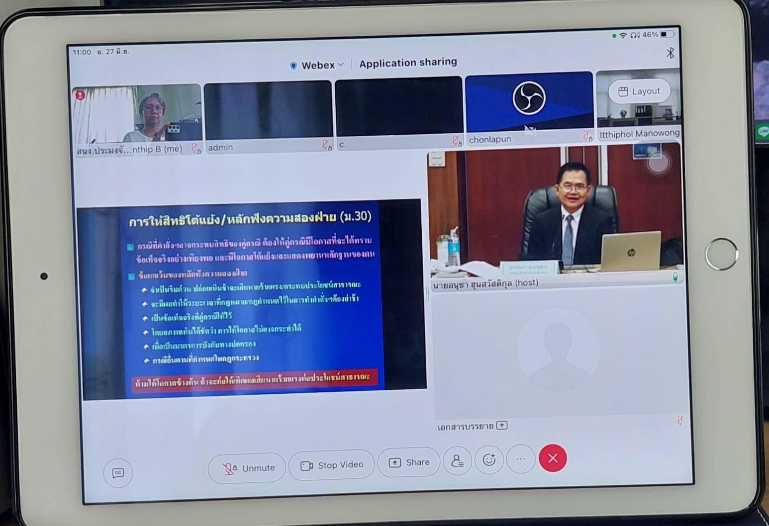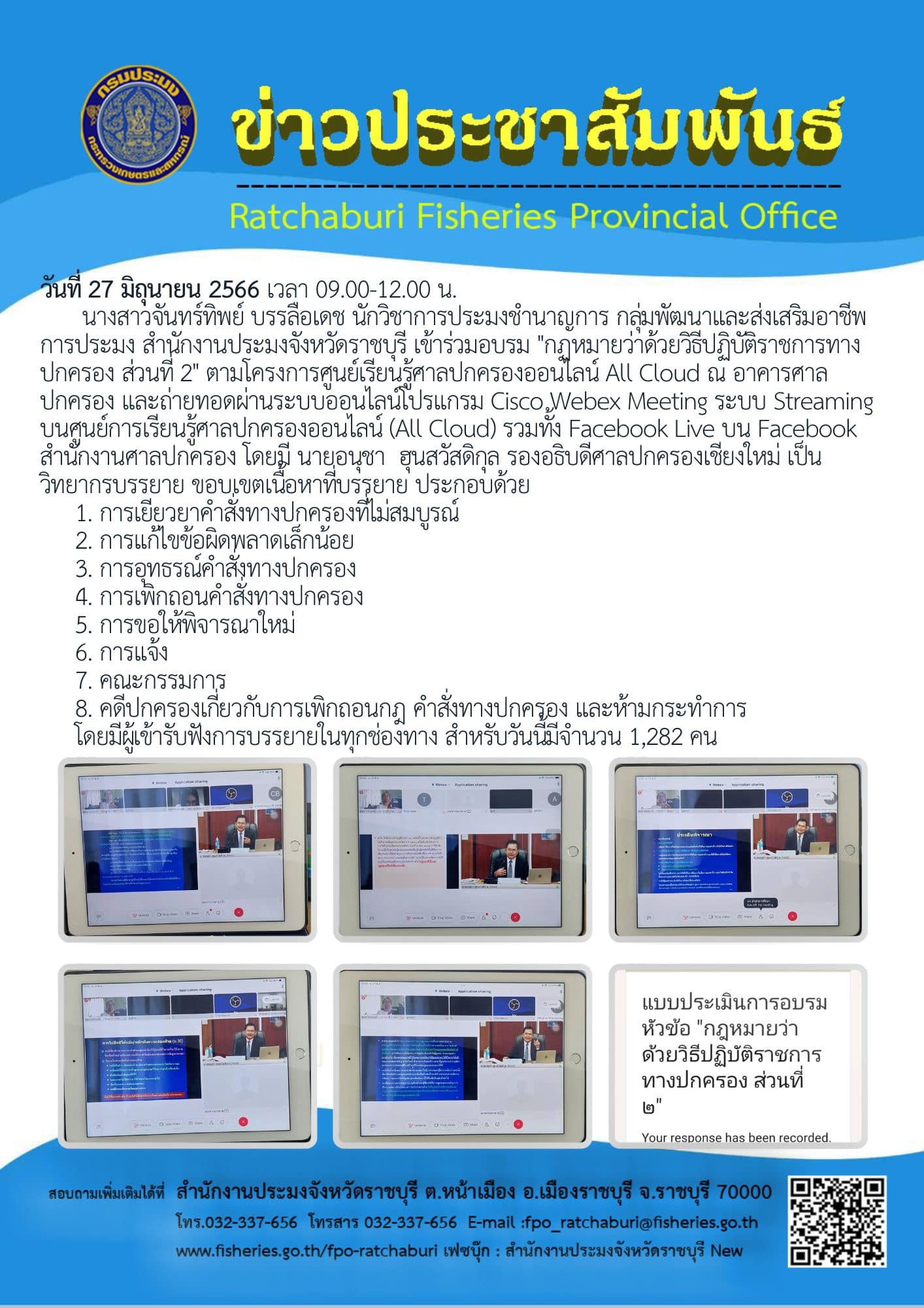 วันที่ 27 มิถุนายน 2566 เวลา 09.00-12.00 น. นางสาวจันทร์ทิพย์ บรรลือเดช นักวิชาการประมงชำนาญการ กลุ่มพัฒนาและส่งเสริมอาชีพการประมง สำนักงานประมงจังหวัดราชบุรี เข้าร่วมอบรม "กฏหมายว่าด้วยวิธีปฏิบัติราชการทางปกครอง ส่วนที่ 2" ตามโครงการศูนย์เรียนรู้ศาลปกครองออนไลน์ All Cloud ณ อาคารศาลปกครอง และถ่ายทอดผ่านระบบออนไลน์โปรแกรม Cisco Webex Meeting ระบบ Streaming บนศูนย์การเรียนรู้ศาลปกครองออนไลน์ (All Cloud) รวมทั้ง Facebook Live บน Facebook สำนักงานศาลปกครอง โดยมี นายอนุชา ฮุนสวัสดิกุล รองอธิบดีศาลปกครองเชียงใหม่ เป็นวิทยากรบรรยาย ขอบเขตเนื้อหาที่บรรยาย ประกอบด้วย