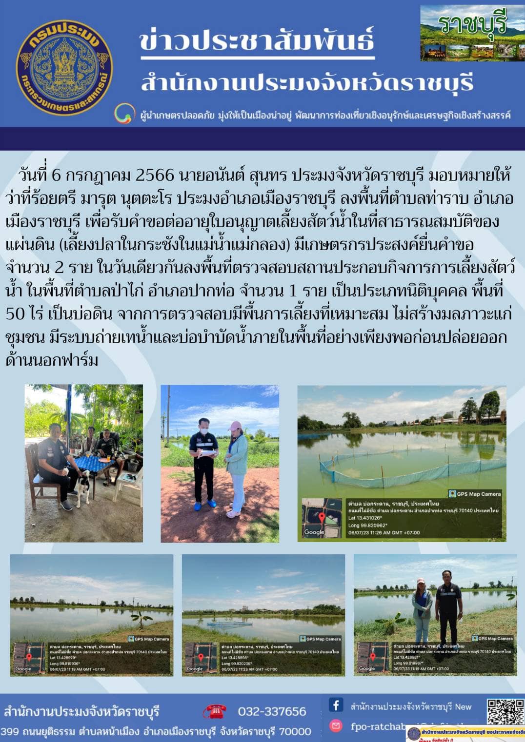วันที่ 6 กรกฎาคม 2566 นายอนันต์ สุนทร ประมงจังหวัดราชบุรี มอบหมายให้ ว่าที่ร้อยตรี มารุต นุตตะโร ประมงอำเภอเมืองราชบุรี ลงพื้นที่ตำบลท่าราบ อำเภอเมืองราชบุรี เพื่อรับคำขอต่ออายุใบอนุญาตเลี้ยงสัตว์น้ำในที่สาธารณสมบัติของแผ่นดิน (เลี้ยงปลาในกระชังในแม่น้ำแม่กลอง) มีเกษตรกรประสงค์ยื่นคำขอ จำนวน 2 ราย