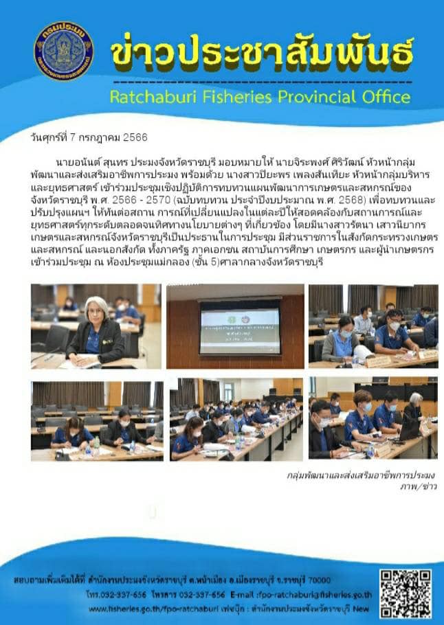 วันศุกร์ที่ 7 กรกฎาคม 2566 นายอนันต์ สุนทร ประมงจังหวัดราชบุรี มอบหมายให้ นายจิระพงศ์ ศิริวัฒน์ หัวหน้ากลุ่มพัฒนาและส่งเสริมอาชีพการประมง พร้อมด้วย นางสาวปิยะพร เพลงสันเทียะ หัวหน้ากลุ่มบริหารและยุทธศาสตร์ เข้าร่วมประชุมเชิงปฏิบัติการทบทวนแผนพัฒนาการเกษตรและสหกรณ์ของจังหวัดราชบุรี พ.ศ. 2566 - 2570 (ฉบับทบทวน ประจำปีงบประมาณ พ.ศ. 2568) เพื่อทบทวนและปรับปรุงแผนฯ ให้ทันต่อสถาน การณ์ที่เปลี่ยนแปลงในแต่ละปีให้สอดคล้องกับสถานการณ์และยุทธศาสตร์ทุกระดับ ตลอดจนทิศทางนโยบายต่างๆ ที่เกี่ยวข้อง โดยมีนางสาวรัตนา เสาวนียากร เกษตรและสหกรณ์จังหวัดราชบุรี เป็นประธานในการประชุม มีส่วนราชการในสังกัดกระทรวงเกษตรและสหกรณ์ และนอกสังกัด ทั้งภาครัฐ ภาคเอกชน สถาบันการศึกษา เกษตรกร และผู้นำเกษตรกร เข้าร่วมประชุม ณ ห้องประชุมแม่กลอง ชั้น 5 ศาลากลางจังหวัดราชบุรี