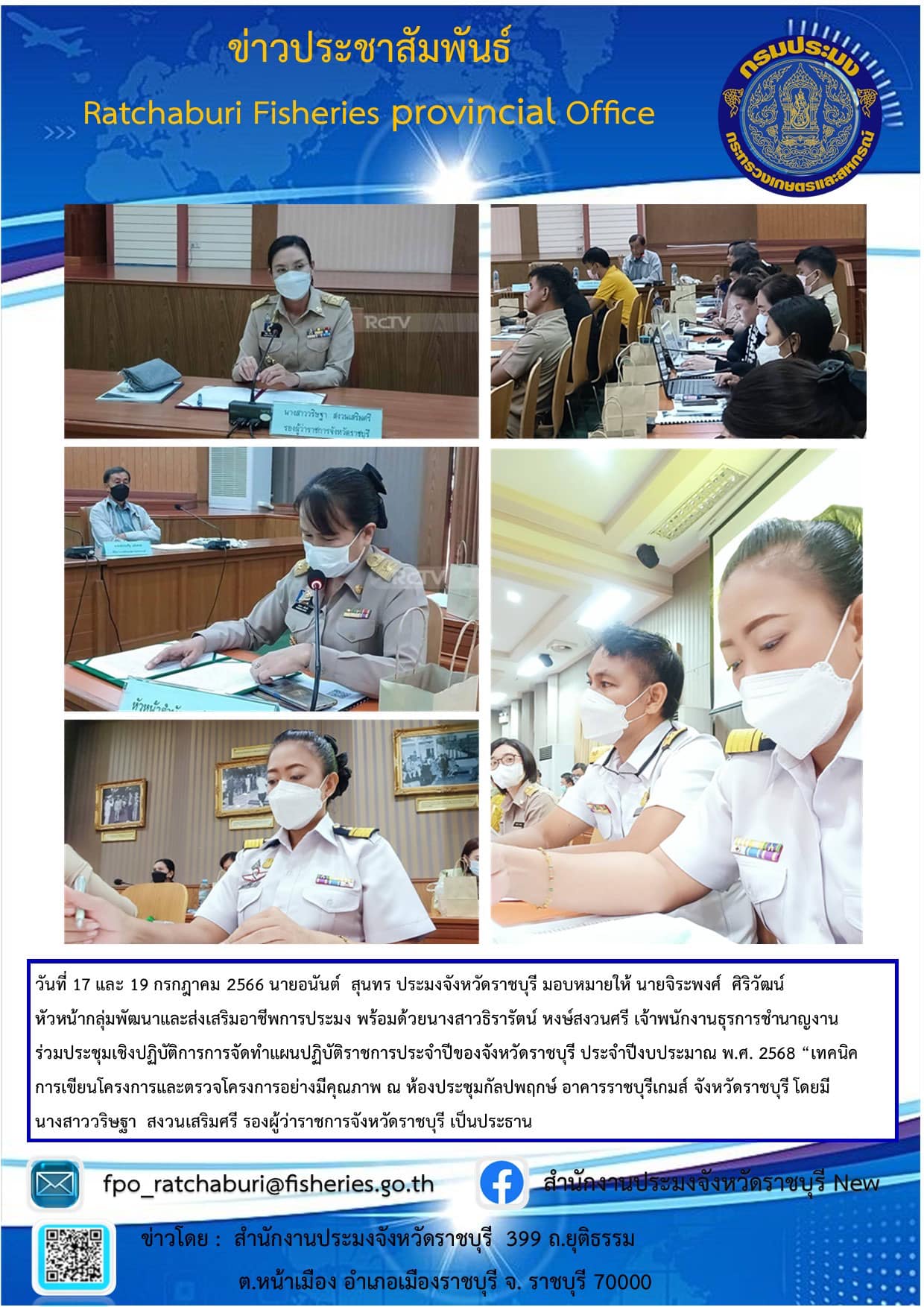 วันที่ 17 และ 19 กรกฎาคม 2566 นายอนันต์ สุนทร ประมงจังหวัดราชบุรี มอบหมายให้ นายจิระพงศ์ ศิริวัฒน์ หัวหน้ากลุ่มพัฒนาและส่งเสริมอาชีพการประมง พร้อมด้วย นางสาวธิรารัตน์ หงษ์สงวนศรี เจ้าพนักงานธุรการชำนาญงาน ร่วมประชุมเชิงปฏิบัติการการจัดทำแผนปฏิบัติราชการประจำปีของจังหวัดราชบุรี ประจำปีงบประมาณ พ.ศ. 2568 “เทคนิคการเขียนโครงการและตรวจโครงการอย่างมีคุณภาพ ณ ห้องประชุมกัลปพฤกษ์ อาคารราชบุรีเกมส์ จังหวัดราชบุรี โดยมีนางสาววริษฐา สงวนเสริมศรี รองผู้ว่าราชการจังหวัดราชบุรี เป็นประธาน