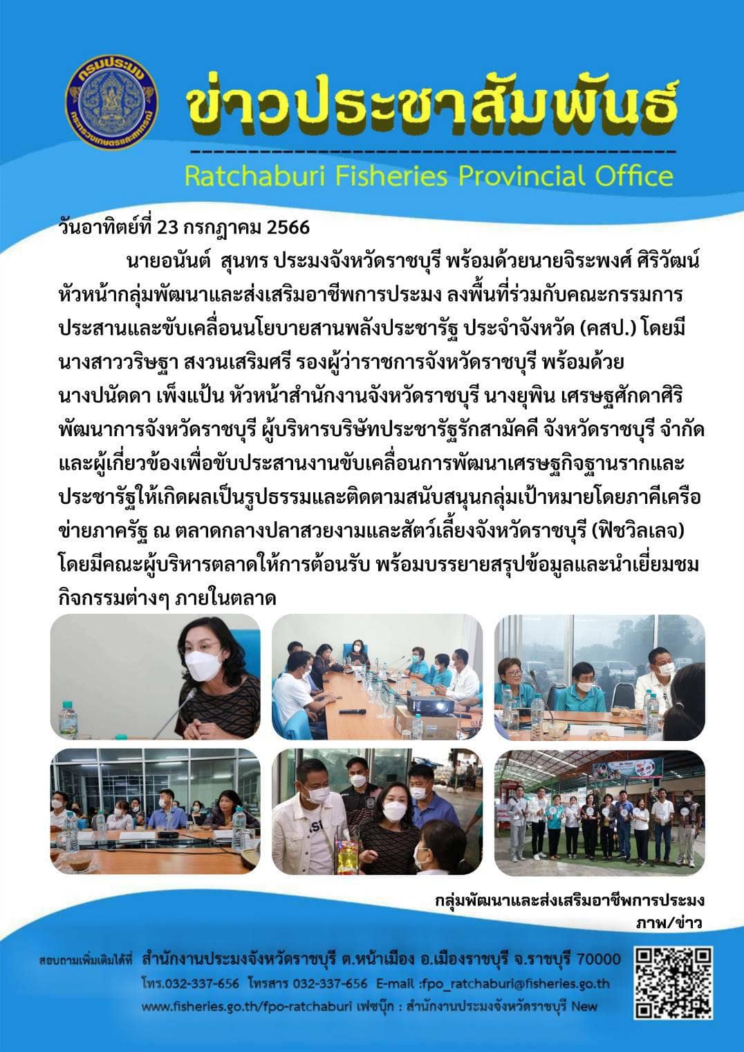 วันอาทิตย์ที่ 23 กรกฎาคม 2566 นายอนันต์ สุนทร ประมงจังหวัดราชบุรี พร้อมด้วย นายจิระพงศ์ ศิริวัฒน์ หัวหน้ากลุ่มพัฒนาและส่งเสริมอาชีพการประมง ลงพื้นที่ร่วมกับคณะกรรมการประสานและขับเคลื่อนนโยบายสานพลังประชารัฐ ประจำจังหวัด (คสป.) โดยมี นางสาววริษฐา สงวนเสริมศรี รองผู้ว่าราชการจังหวัดราชบุรี พร้อมด้วยนางปนัดดา เพ็งแป้น หัวหน้าสำนักงานจังหวัดราชบุรี นางยุพิน เศรษฐศักดาศิริ พัฒนาการจังหวัดราชบุรี ผู้บริหารบริษัทประชารัฐรักสามัคคี จังหวัดราชบุรี จำกัด และผู้เกี่ยวข้องเพื่อขับประสานงานขับเคลื่อนการพัฒนาเศรษฐกิจฐานรากและประชารัฐให้เกิดผลเป็นรูปธรรมและติดตามสนับสนุนกลุ่มเป้าหมายโดยภาคีเครือข่ายภาครัฐ ณ ตลาดกลางปลาสวยงามและสัตว์เลี้ยงจังหวัดราชบุรี (ฟิช วิลเลจ)โดยมีคณะผู้บริหารตลาดให้การต้อนรับ พร้อมบรรยายสรุปข้อมูลและนำเยี่ยมชมกิจกรรมต่างๆ ภายในตลาด