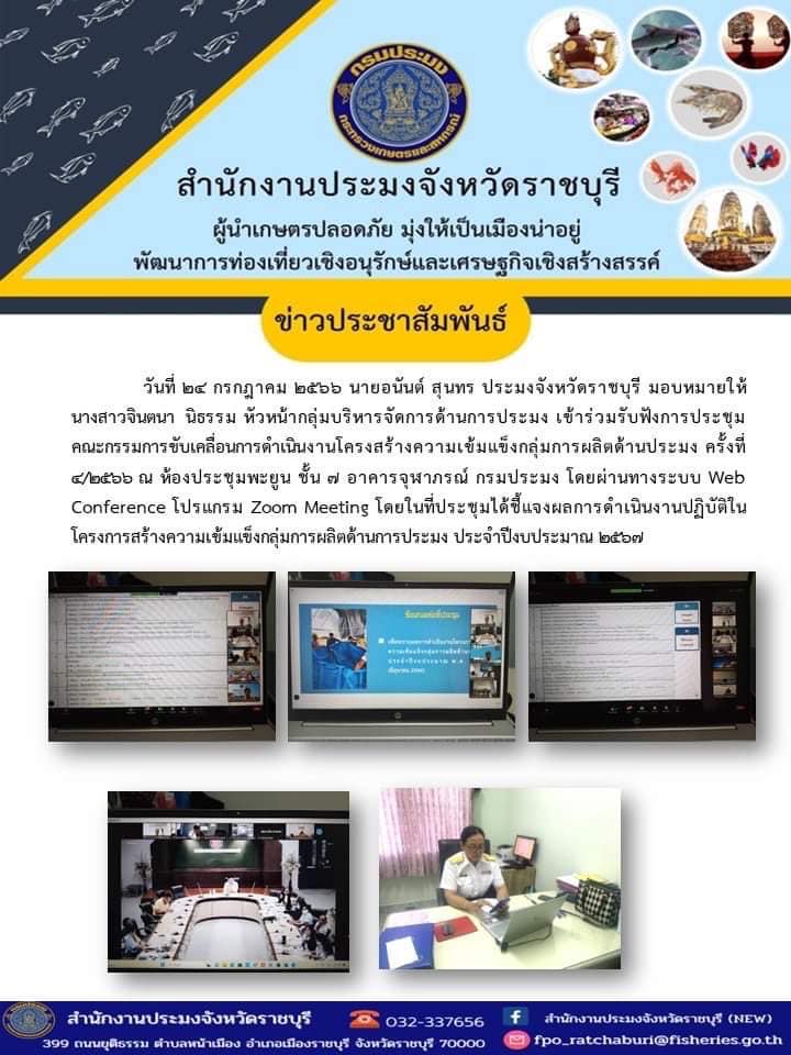 วันที่ 24 กรกฎาคม 2566 นายอนันต์ สุนทร ประมงจังหวัดราชบุรี มอบหมายให้ นางสาวจินตนา นิธรรม หัวหน้ากลุ่มบริหารจัดการด้านการประมง เข้าร่วมรับฟังการประชุมคณะกรรมการขับเคลื่อนการดำเนินงานโครงสร้างความเข้มแข็งกลุ่มการผลิตด้านประมง ครั้งที่4/2566 ณ ห้องประชุมพะยูน ชั้น 7 อาคารจุฬาภรณ์ กรมประมง โดยผ่านทางระบบ Web Conference โปรแกรม Zoom Meeting โดยในที่ประชุมได้ชี้แจงผลการดำเนินงานปฏิบัติในโครงการสร้างความเข้มแข็งกลุ่มการผลิตด้านการประมง ประจำปีงบประมาณ 2567