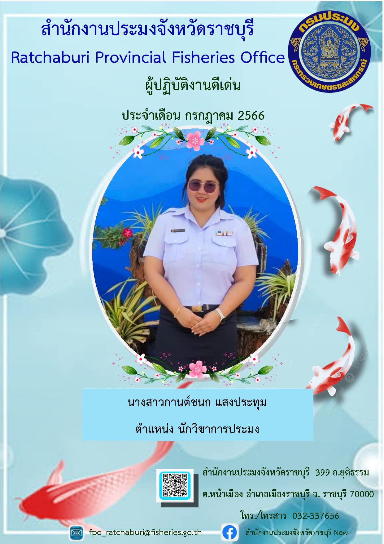 สำนักงานประมงจังหวัดราชบุรี จัดให้มีการประกาศยกย่องผู้ปฏิบัติงานดีเด่นที่มีผลงานเชิงประจักษ์ ประจำเดือน กรกฎาคม พ.ศ. 2566 โดยมีวัตถุประสงค์ เพื่อยกย่องเชิดชูเกียรติแก่ผู้ปฏิบัติงานที่มีผลงานดีเด่นเป็นที่ยอมรับเกิดประโยชน์แก่ทางราชการ และเป็นการสร้างขวัญกำลังใจในการปฏิบัติหน้าที่ราชการแก่บุคลากรในสังกัด