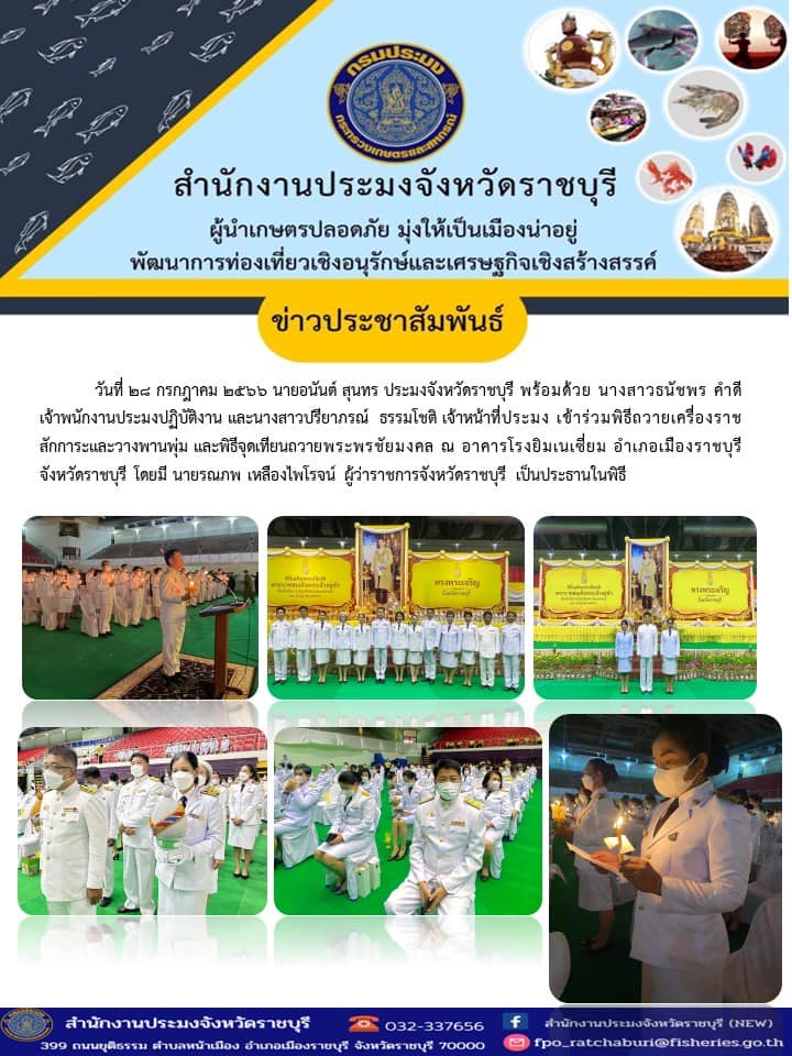 วันที่ 28 กรกฎาคม 2566 นายอนันต์ สุนทร ประมงจังหวัดราชบุรี พร้อมด้วย นางสาวธนัชพร คำดี เจ้าพนักงานประมงปฏิบัติงาน และนางสาวปรียาภรณ์ ธรรมโชติ เจ้าหน้าที่ประมง เข้าร่วมพิธีถวายเครื่องราชสักการะและวางพานพุ่ม และพิธีจุดเทียนถวายพระพรชัยมงคล ณ อาคารโรงยิมเนเซี่ยม อำเภอเมืองราชบุรี จังหวัดราชบุรี โดยมี นายรณภพ เหลืองไพโรจน์ ผู้ว่าราชการจังหวัดราชบุรี เป็นประธานในพิธี
