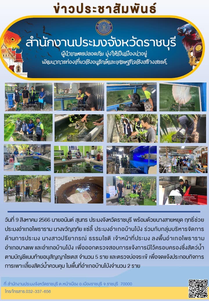 วันที่ 9 สิงหาคม 2566 นายอนันต์ สุนทร ประมงจังหวัดราชบุรี พร้อมด้วย นางสายหยุด ฤทธิ์ช่วย ประมงอำเภอโพธาราม นางขวัญฤทัย แซ่ลี้ ประมงอำเภอบ้านโป่ง ร่วมกับกลุ่มบริหารจัดการด้านการประมง นางสาวปรียาภรณ์ ธรรมโชติ เจ้าหน้าที่ประมง ลงพื้นอำเภอโพธาราม อำเภอบางแพ และอำเภอบ้านโป่ง เพื่อออกตรวจสอบการแจ้งการมีไว้ครอบครองซึ่งสัตว์น้ำ ตามบัญชีแนบท้ายอนุสัญญาไซเตส เกษตรกร จำนวน 5 ราย และตรวจบ่อจระเข้ เพื่อจดแจ้งประกอบกิจการการเพาะเลี้ยงสัตว์น้ำควบคุม ในพื้นที่อำเภอบ้านโป่งจำนวน 2 ราย