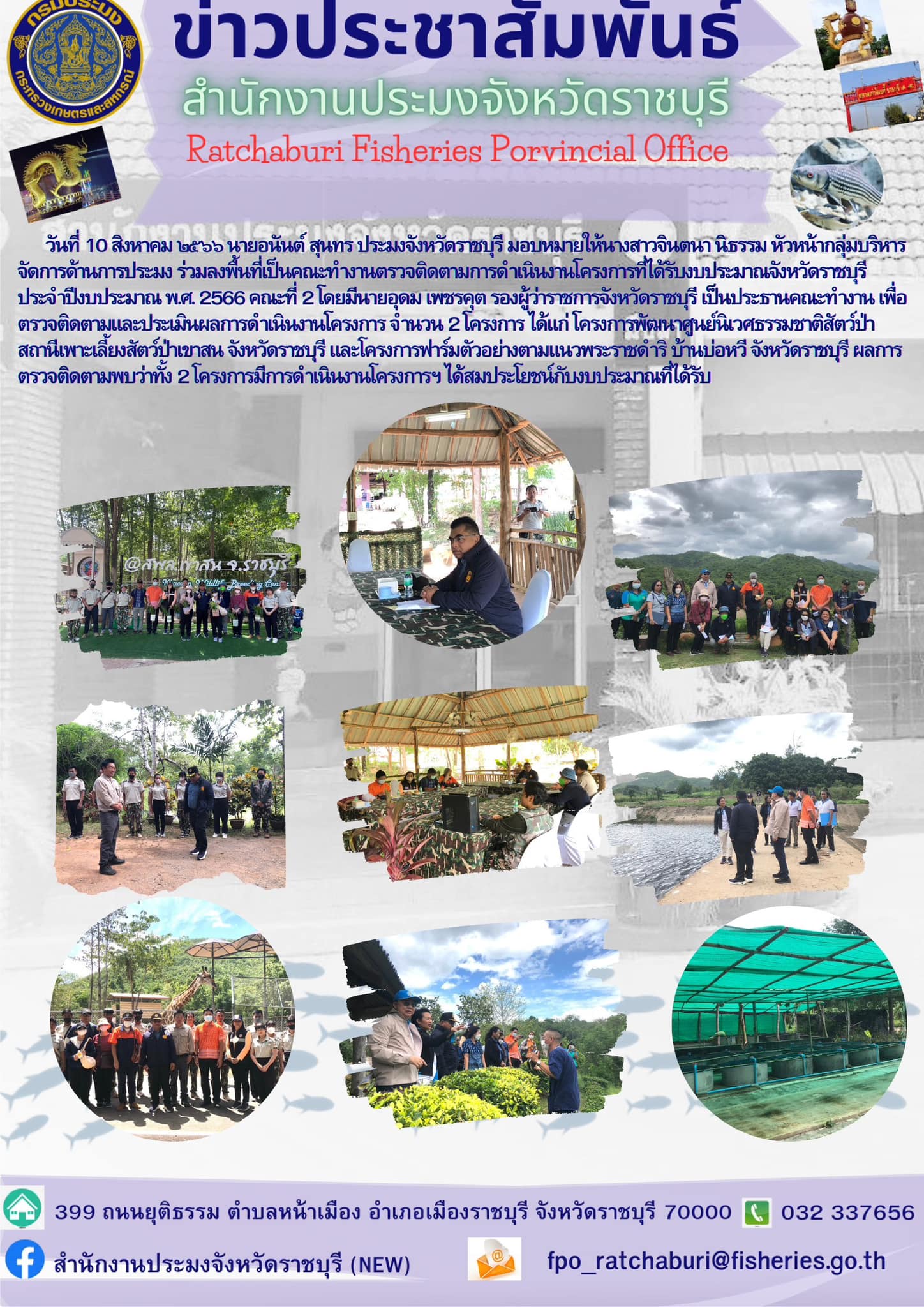 วันที่ 10 สิงหาคม 2566 นายอนันต์ สุนทร ประมงจังหวัดราชบุรี มอบหมายให้ นางสาวจินตนา นิธรรม หัวหน้ากลุ่มบริหารจัดการด้านการประมง ร่วมลงพื้นที่เป็นคณะทำงานตรวจติดตามการดำเนินงานโครงการที่ได้รับงบประมาณจังหวัดราชบุรี ประจำปีงบประมาณ พ.ศ. 2566 คณะที่ 2 โดยมีนายอุดม เพชรคุต รองผู้ว่าราชการจังหวัดราชบุรี เป็นประธานคณะทำงาน เพื่อตรวจติดตามและประเมินผลการดำเนินงานโครงการ จำนวน 2 โครงการ ได้แก่ โครงการพัฒนาศูนย์นิเวศธรรมชาติสัตว์ป่า สถานีเพาะเลี้ยงสัตว์ป่าเขาสน จังหวัดราชบุรี และโครงการฟาร์มตัวอย่างตามแนวพระราชดำริ บ้านบ่อหวี จังหวัดราชบุรี ผลการตรวจติดตามพบว่าทั้ง 2 โครงการมีการดำเนินงานโครงการฯ ได้สมประโยชน์กับงบประมาณที่ได้รับ