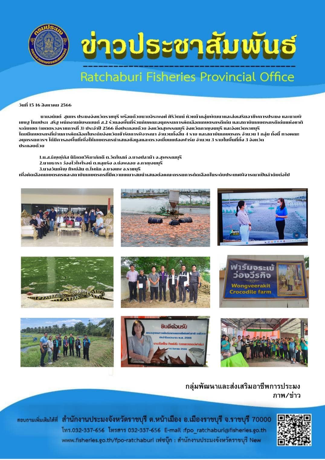 วันที่ 15-16 สิงหาคม 2566 นายอนันต์ สุนทร ประมงจังหวัดราชบุรี พร้อมด้วย นายจิระพงศ์ ศิริวัฒน์ หัวหน้ากลุ่มพัฒนาและส่งเสริมอาชีพการประมง และนายพิเชษฐ ไทยประเสริฐ พนักงานขับรถยนต์ ส.2 ร่วมลงพื้นที่ร่วมกับคณะอนุกรรมการคัดเลือกเกษตรกรดีเด่น และสถาบันเกษตรกรดีเด่นแห่งชาติ ระดับเขต (เขตตรวจราชการที่ 3) ประจำปี 2566 ซึ่งประกอบด้วย จังหวัดสุพรรณบุรี จังหวัดกาญจนบุรี และจังหวัดราชบุรีมีนายประวิทย์ ขำร้าย ผู้ตรวจราชการเขต 3 เป็นประธานคณะอนุกรรมการ และมีเกษตรกรที่ผ่านการคัดเลือกในระดับจังหวัดเข้ารับการพิจารณา จำนวนทั้งสิ้น 4 ราย และสถาบันเกษตรกร จำนวน 1 กลุ่ม ทั้งนี้ทางคณะอนุกรรมการฯ ได้มีการลงพื้นที่เพื่อให้เกษตรกรนำเสนอข้อมูลและตรวจเยี่ยมแปลงฟาร์ม จำนวน 3 รายในพื้นที่ทั้ง 3 จังหวัด ประกอบด้วย