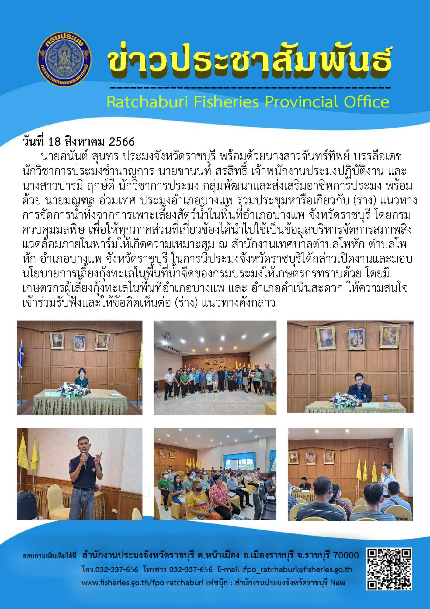 วันที่ 18 สิงหาคม 2566 นายอนันต์ สุนทร ประมงจังหวัดราชบุรี พร้อมด้วยนางสาวจันทร์ทิพย์ บรรลือเดช นักวิชาการประมงชำนาญการ นายชานนท์ สรสิทธิ์ เจ้าพนักงานประมงปฏิบัติงาน และ นางสาวปารมี ฤกษ์ดี นักวิชาการประมง กลุ่มพัฒนาและส่งเสริมอาชีพการประมง พร้อมด้วย นายมณฑล อ่วมเทศ ประมงอำเภอบางแพ ร่วมประชุมหารือเกี่ยวกับ (ร่าง) แนวทางการจัดการน้ำทิ้งจากการเพาะเลี้ยงสัตว์น้ำในพื้นที่อำเภอบางแพ จังหวัดราชบุรี โดยกรมควบคุมมลพิษ เพื่อให้ทุกภาคส่วนที่เกี่ยวข้องได้นำไปใช้เป็นข้อมูลบริหารจัดการสภาพสิ่งแวดล้อมภายในฟาร์มให้เกิดความเหมาะสม ณ สำนักงานเทศบาลตำบลโพหัก ตำบลโพหัก อำเภอบางแพ จังหวัดราชบุรี ในการนี้ประมงจังหวัดราชบุรีได้กล่าวเปิดงานและมอบนโยบายการเลี้ยงกุ้งทะเลในพื้นที่น้ำจืดของกรมประมงให้เกษตรกรทราบด้วย โดยมี เกษตรกรผู้เลี้ยงกุ้งทะเลในพื้นที่อำเภอบางแพ และ อำเภอดำเนินสะดวก ให้ความสนใจเข้าร่วมรับฟังและให้ข้อคิดเห็นต่อ (ร่าง) แนวทางดังกล่าว