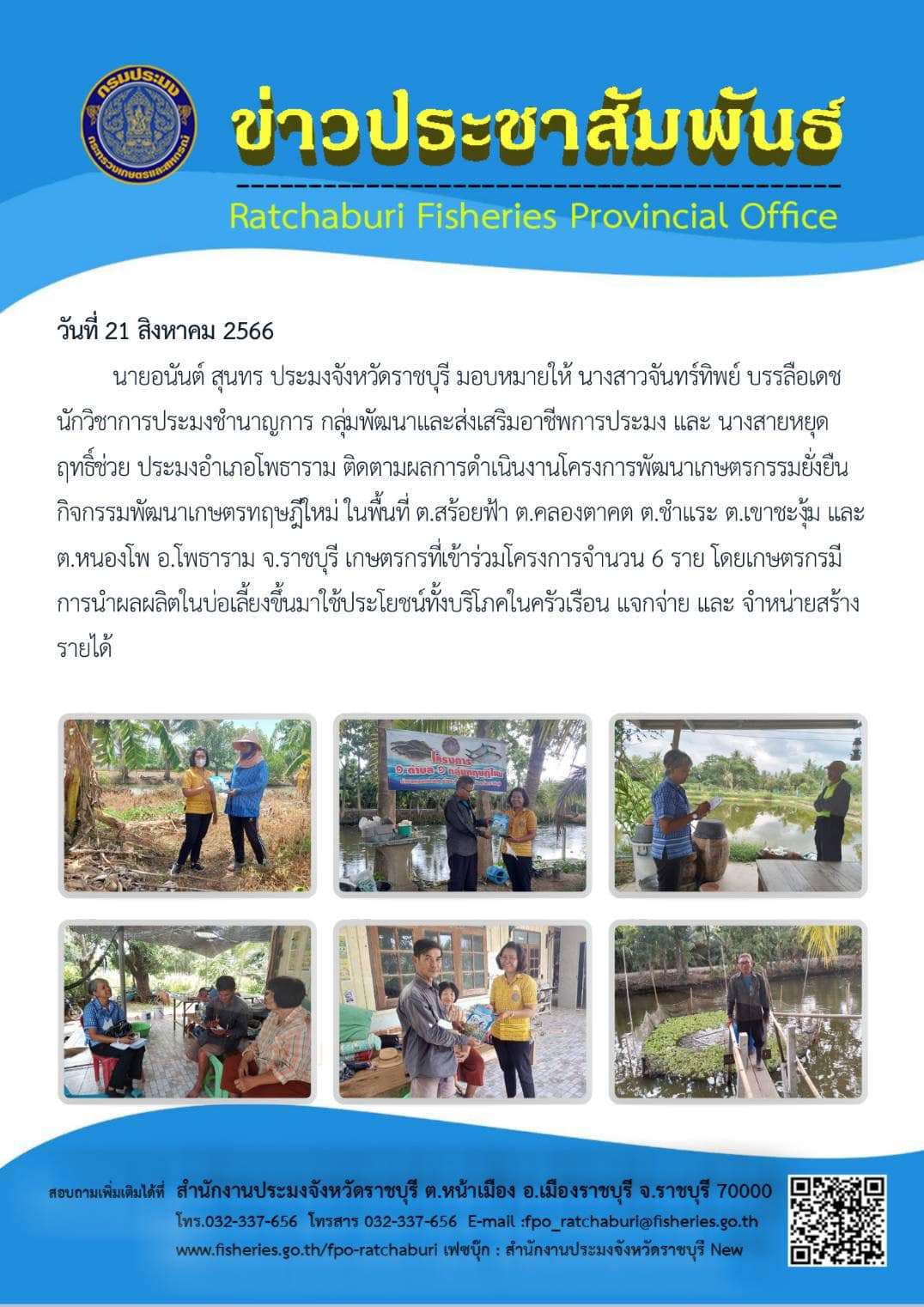 วันที่ 21 สิงหาคม 2566 นายอนันต์ สุนทร ประมงจังหวัดราชบุรี มอบหมายให้ นางสาวจันทร์ทิพย์ บรรลือเดช นักวิชาการประมงชำนาญการ กลุ่มพัฒนาและส่งเสริมอาชีพการประมง และ นางสายหยุด ฤทธิ์ช่วย ประมงอำเภอโพธาราม ติดตามผลการดำเนินงานโครงการพัฒนาเกษตรกรรมยั่งยืน กิจกรรมพัฒนาเกษตรทฤษฎีใหม่ ในพื้นที่ ตำบลสร้อยฟ้า ตำบลคลองตาคต ตำบลชำแระ ตำบลเขาชะงุ้ม และ ตำบลหนองโพ อำเภอโพธาราม จังหวัดราชบุรี เกษตรกรที่เข้าร่วมโครงการจำนวน 6 ราย โดยเกษตรกรมีการนำผลผลิตในบ่อเลี้ยงขึ้นมาใช้ประโยชน์ทั้งบริโภคในครัวเรือน แจกจ่าย และ จำหน่ายสร้างรายได้