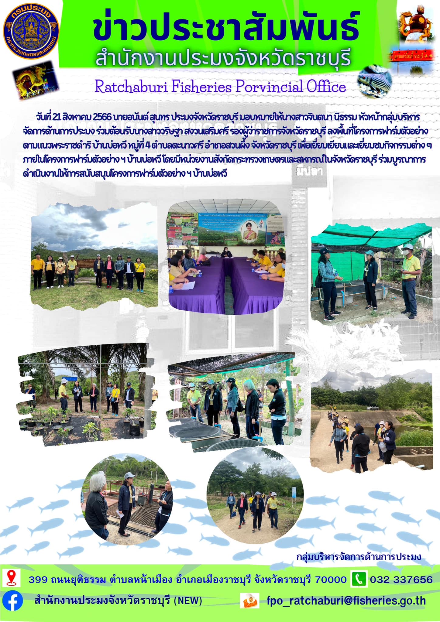 วันที่ 21 สิงหาคม 2566 นายอนันต์ สุนทร ประมงจังหวัดราชบุรี มอบหมายให้ นางสาวจินตนา นิธรรม หัวหน้ากลุ่มบริหารจัดการด้านการประมง ร่วมต้อนรับ นางสาววริษฐา สงวนเสริมศรี รองผู้ว่าราชการจังหวัดราชบุรี ลงพื้นที่โครงการฟาร์มตัวอย่างตามแนวพระราชดำริ บ้านบ่อหวี หมู่ที่ 4 ตำบลตะนาวศรี อำเภอสวนผึ้ง จังหวัดราชบุรี เพื่อเยี่ยมเยียนและเยี่ยมชมกิจกรรมต่าง ๆ ภายในโครงการฟาร์มตัวอย่างฯ บ้านบ่อหวี โดยมีหน่วยงานสังกัดกระทรวงเกษตรและสหกรณ์ในจังหวัดราชบุรี ร่วมบูรณาการดำเนินงานให้การสนับสนุนโครงการฟาร์มตัวอย่าง ฯ บ้านบ่อหวี