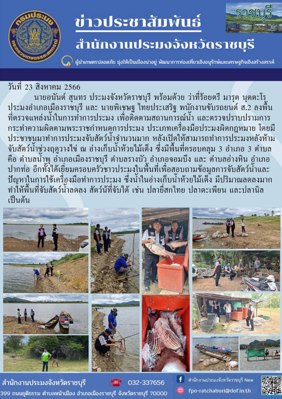 วันที่ 23 สิงหาคม 2566 นายอนันต์ สุนทร ประมงจังหวัดราชบุรี พร้อมด้วย ว่าที่ร้อยตรี มารุต นุตตะโร ประมงอำเภอเมืองราชบุรี และ นายพิเชษฐ ไทยประเสริฐ พนักงานขับรถยนต์ ส.2 ลงพื้นที่ตรวจแหล่งน้ำในการทำการประมง เพื่อติดตามสถานการณ์น้ำ และตรวจปราบปรามการกระทำความผิดตามพระราชกำหนดการประมง ประเภทเครื่องมือประมงผิดกฎหมาย โดยมีประชาชนมาทำการประมงจับสัตว์น้ำจำนวนมาก หลังเปิดให้สามารถทำการประมงหลังห้ามจับสัตว์น้ำช่วงฤดูวางไข่ ณ อ่างเก็บน้ำห้วยไม้เต็ง ซึ่งมีพื้นที่ครอบคลุม 3 อำเภอ 3 ตำบล คือ ตำบลน้ำพุ อำเภอเมืองราชบุรี ตำบลรางบัว อำเภอจอมบึง และ ตำบลอ่างหิน อำเภอปากท่อ อีกทั้งได้เยี่ยมครอบครัวชาวประมงในพื้นที่เพื่อสอบถามข้อมูลการจับสัตว์น้ำและปัญหาในการใช้เครื่องมือทำการประมง ซึ่งน้ำในอ่างเก็บน้ำห้วยไม้เต็ง มีปริมาณลดลงมาก ทำให้พื้นที่จับสัตว์น้ำลดลง สัตว์น้ำที่จับได้ เช่น ปลายี่สกไทย ปลาตะเพียน และปลานิล เป็นต้น