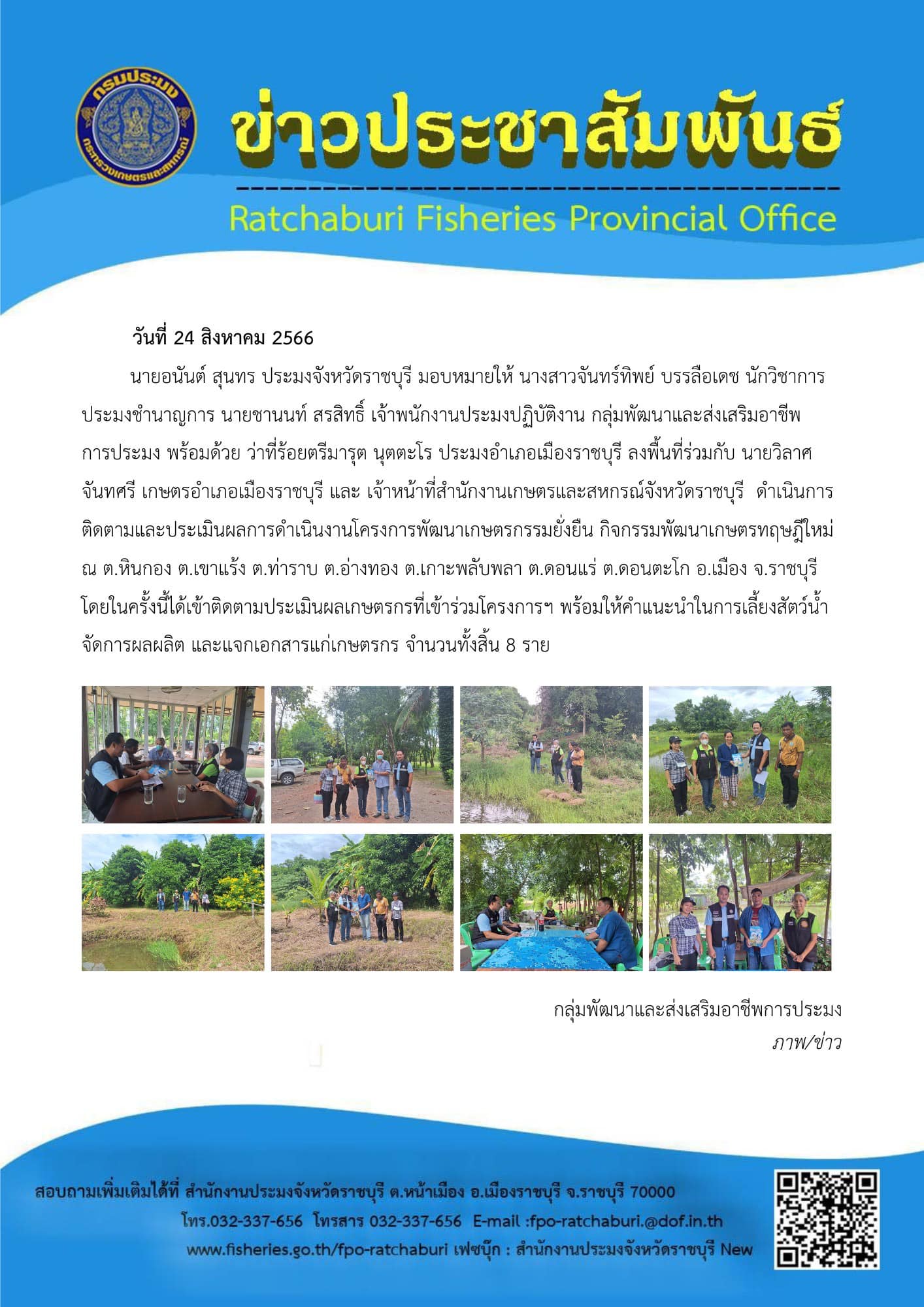 วันที่ 24 สิงหาคม 2566 นายอนันต์ สุนทร ประมงจังหวัดราชบุรี มอบหมายให้ นางสาวจันทร์ทิพย์ บรรลือเดช นักวิชาการประมงชำนาญการ นายชานนท์ สรสิทธิ์ เจ้าพนักงานประมงปฏิบัติงาน กลุ่มพัฒนาและส่งเสริมอาชีพการประมง พร้อมด้วย ว่าที่ร้อยตรีมารุต นุตตะโร ประมงอำเภอเมืองราชบุรี ลงพื้นที่ร่วมกับ นายวิลาศ จันทศรี เกษตรอำเภอเมืองราชบุรี และ เจ้าหน้าที่สำนักงานเกษตรและสหกรณ์จังหวัดราชบุรี ดำเนินการติดตามและประเมินผลการดำเนินงานโครงการพัฒนาเกษตรกรรมยั่งยืน กิจกรรมพัฒนาเกษตรทฤษฎีใหม่ ณ ต.หินกอง ต.เขาแร้ง ต.ท่าราบ ต.อ่างทอง ต.เกาะพลับพลา ต.ดอนแร่ ต.ดอนตะโก อ.เมือง จ.ราชบุรี โดยในครั้งนี้ได้เข้าติดตามประเมินผลเกษตรกรที่เข้าร่วมโครงการฯ พร้อมให้คำแนะนำในการเลี้ยงสัตว์น้ำ จัดการผลผลิต และแจกเอกสารแก่เกษตรกร จำนวนทั้งสิ้น 8 ราย