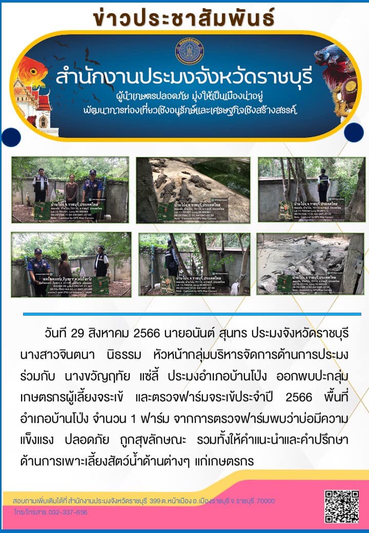ออกพบปะกลุ่มเกษตรกรผู้เลี้ยงจระเข้ และตรวจฟาร์มจระเข้ประจำปี 2566 พื้นที่อำเภอบ้านโป่ง