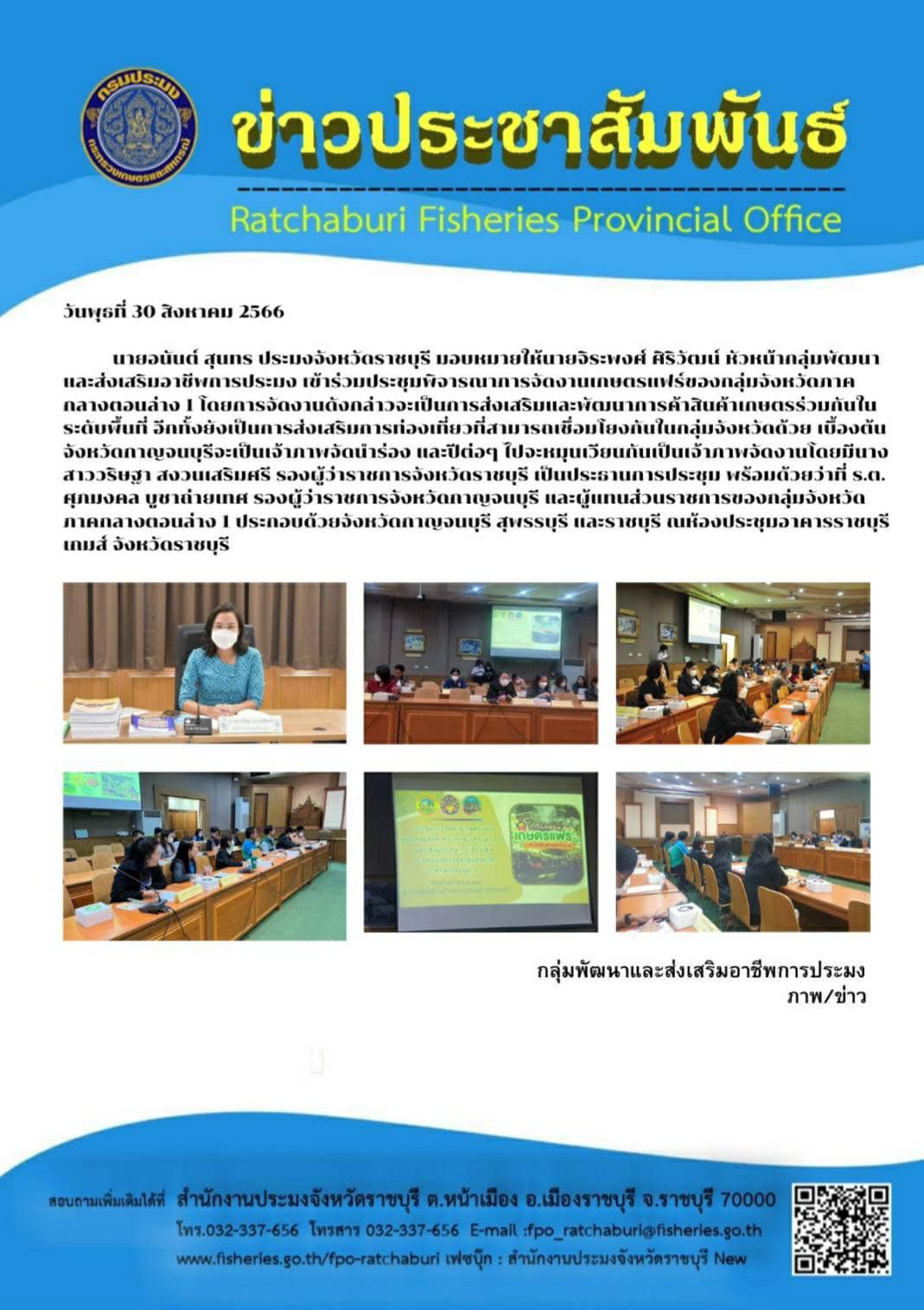 วันพุธที่ 30 สิงหาคม 2566 นายอนันต์ สุนทร ประมงจังหวัดราชบุรี มอบหมายให้นายจิระพงศ์ ศิริวัฒน์ หัวหน้ากลุ่มพัฒนาและส่งเสริมอาชีพการประมง เข้าร่วมประชุมพิจารณาการจัดงานเกษตรแฟร์ของกลุ่มจังหวัดภาคกลางตอนล่าง 1 โดยการจัดงานดังกล่าวจะเป็นการส่งเสริมและพัฒนาการค้าสินค้าเกษตรร่วมกันในระดับพื้นที่ อีกทั้งยังเป็นการส่งเสริมการท่องเที่ยวที่สามารถเชื่อมโยงกันในกลุ่มจังหวัดด้วย เบื้องต้นจังหวัดกาญจนบุรีจะเป็นเจ้าภาพจัดนำร่อง และปีต่อๆ ไปจะหมุนเวียนกันเป็นเจ้าภาพจัดงานโดยมี นางสาววริษฐา สงวนเสริมศรี รองผู้ว่าราชการจังหวัดราชบุรี เป็นประธานการประชุม พร้อมด้วยว่าที่ ร.ต. ศุภมงคล บูชาถ่ายเทศ รองผู้ว่าราชการจังหวัดกาญจนบุรี และผู้แทนส่วนราชการของกลุ่มจังหวัดภาคกลางตอนล่าง 1 ประกอบด้วยจังหวัดกาญจนบุรี สุพรรบุรี และราชบุรี ณ ห้องประชุมอาคารราชบุรีเกมส์ จังหวัดราชบุรี