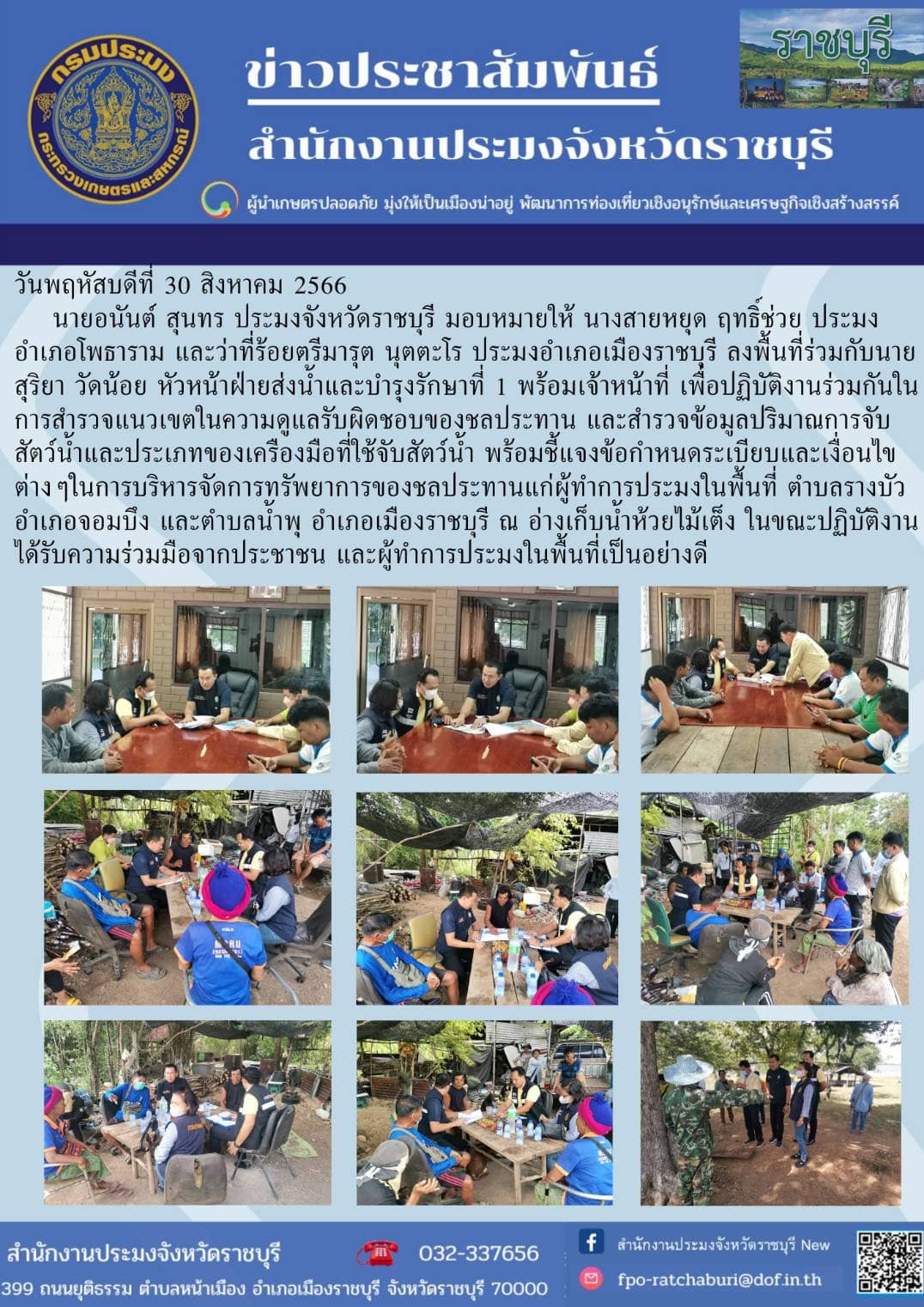 วันพุธที่ 30 สิงหาคม 2566 นายอนันต์ สุนทร ประมงจังหวัดราชบุรี มอบหมายให้ นางสายหยุด ฤทธิ์ช่วย ประมงอำเภอโพธาราม และว่าที่ร้อยตรีมารุต นุตตะโร ประมงอำเภอเมืองราชบุรี ลงพื้นที่ร่วมกับนายสุริยา วัดน้อย หัวหน้าฝ่ายส่งน้ำและบำรุงรักษาที่ 1 พร้อมเจ้าหน้าที่ เพื่อปฏิบัติงานร่วมกันในการสำรวจแนวเขตในความดูแลรับผิดชอบของชลประทาน และสำรวจข้อมูลปริมาณการจับสัตว์น้ำและประเภทของเครืองมือที่ใช้จับสัตว์น้ำ พร้อมชี้แจงข้อกำหนดระเบียบและเงื่อนไขต่างๆในการบริหารจัดการทรัพยาการของชลประทานแก่ผู้ทำการประมงในพื้นที่ ตำบลรางบัว อำเภอจอมบึง และตำบลน้ำพุ อำเภอเมืองราชบุรี ณ อ่างเก็บน้ำห้วยไม้เต็ง ในขณะปฏิบัติงานได้รับความร่วมมือจากประชาชน และผู้ทำการประมงในพื้นที่เป็นอย่างดี