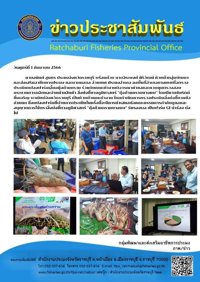 วันศุกร์ที่ 1 กันยายน 2566 นายอนันต์ สุนทร ประมงจังหวัดราชบุรี พร้อมด้วย นายจิระพงศ์ ศิริวัฒน์ หัวหน้ากลุ่มพัฒนาและส่งเสริมอาชีพการประมง และนายมลฑล อ่วมเทศ ประมงอำเภอ ลงพื้นที่อำเภอบางแพเพื่อตรวจประเมินแปลงฟาร์มเลี้ยงกุ้งก้ามกราม ร่วมกับคณะทำงานพิจารณาคำขอและควบคุมตรวจสอบกระบวนการผลิตและจำหน่ายสินค้า สิ่งบ่งชี้ทางภูมิศาสตร์ "กุ้งก้ามกรามบางแพ" โดยมีนายชัยรัตน์ ชื่นเจริญ พาณิชย์จังหวัดราชบุรี เป็นหัวหน้าคณะทำงาน โดยดำเนินการตรวจประเมินสิ่งบ่งชี้ตามข้อกำหนด ซึ่งแปลงฟาร์มที่ผ่านการประเมินในครั้งนี้จะมีการนำเสนอต่อคณะกรรมการกำกับดูแลและอนุญาตการใช้ตราสิ่งบ่งชี้ทางภูมิศาสตร์ "กุ้งก้ามกรามบางแพ" รับรองผล เป็นฟาร์ม GI นำร่อง ต่อไป