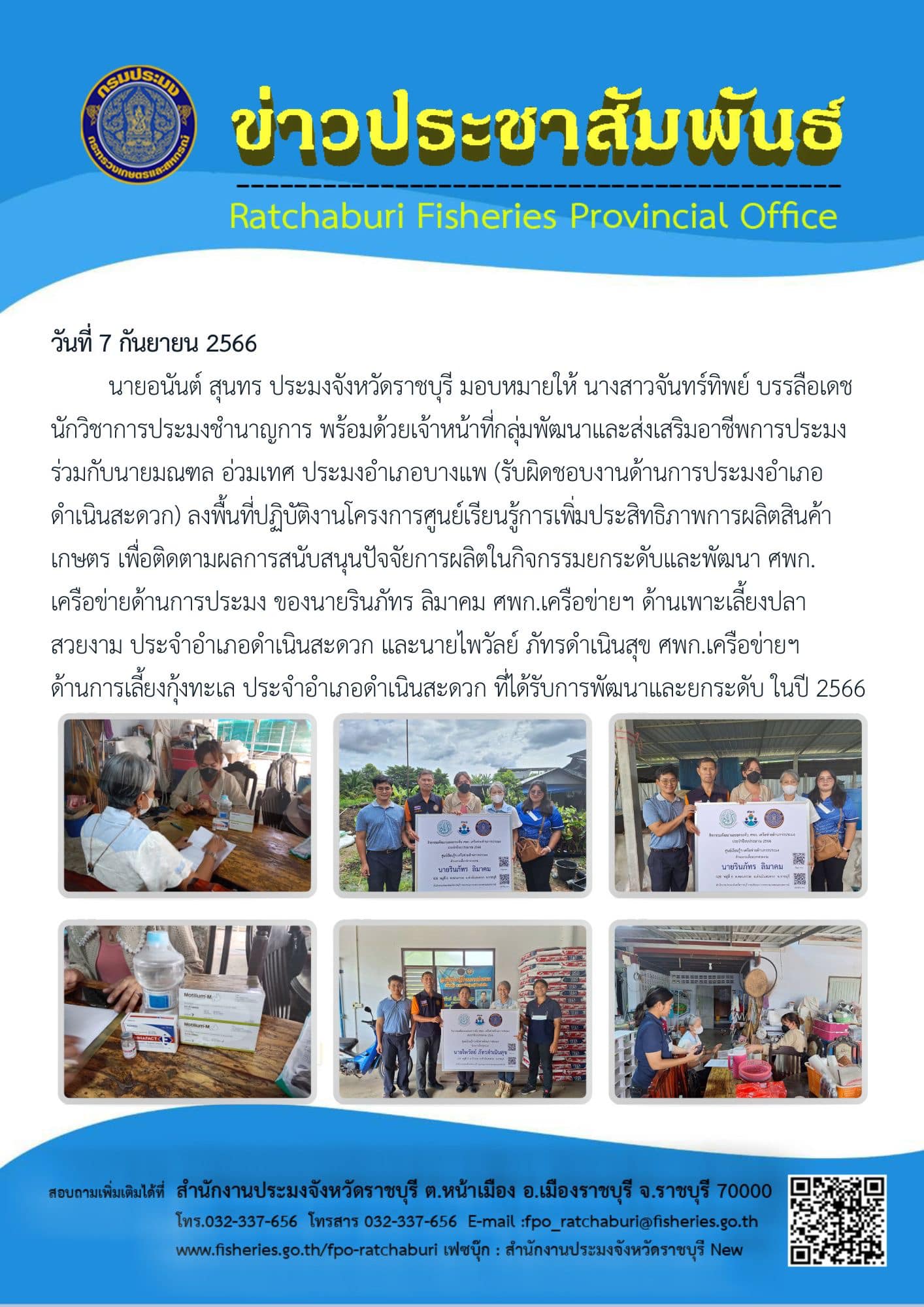 วันที่ 7 กันยายน 2566 นายอนันต์ สุนทร ประมงจังหวัดราชบุรี มอบหมายให้ นางสาวจันทร์ทิพย์ บรรลือเดช นักวิชาการประมงชำนาญการ พร้อมด้วย เจ้าหน้าที่กลุ่มพัฒนาและส่งเสริมอาชีพการประมง ร่วมกับ นายมณฑล อ่วมเทศ ประมงอำเภอบางแพ (รับผิดชอบงานด้านการประมงอำเภอดำเนินสะดวก) ลงพื้นที่ปฏิบัติงานโครงการศูนย์เรียนรู้การเพิ่มประสิทธิภาพการผลิตสินค้าเกษตร เพื่อติดตามผลการสนับสนุนปัจจัยการผลิตในกิจกรรมยกระดับและพัฒนา ศพก.เครือข่ายด้านการประมง ของนายรินภัทร ลิมาคม ศพก.เครือข่ายฯ ด้านเพาะเลี้ยงปลาสวยงาม ประจำอำเภอดำเนินสะดวก และนายไพวัลย์ ภัทรดำเนินสุข ศพก.เครือข่ายฯ ด้านการเลี้ยงกุ้งทะเล ประจำอำเภอดำเนินสะดวก ที่ได้รับการพัฒนาและยกระดับ ในปี 2566